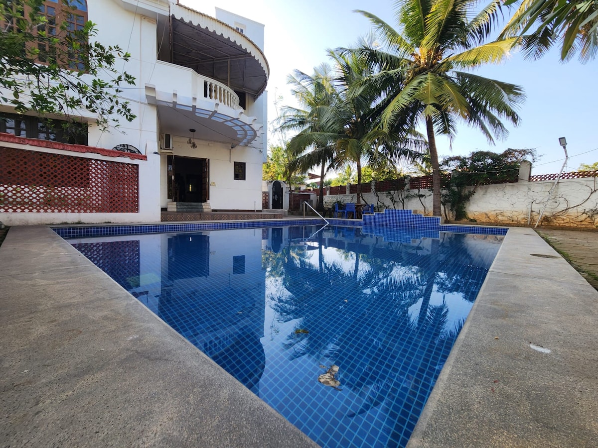 A fantastical 1200sqft fully private 3 bedroom villa in a safe posh peaceful property. NO PARTIES 300m to beach from main Gate 2 pools for a blissful day with friends family. Villa has interconnected rooms with locks, private entrances. 2 acre garden. . For 6ppl (Floor bed +4 Chargeable) NO SEAFOOD indoor NOT a hotel, No food served Swigy available. NO MUSIC/Drugs No smoking indoors. POOL/villa MAY HAVE small bugs/ frogs IN RAIN SEASON THIS CANT BE CONTROLLED ITS A FARM HOUSE. NO REFUND