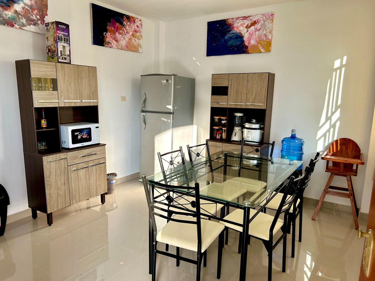 Un spațiu cu vedere la MARE, veți vedea zmeul, aripa, folia și surful (farul) zburând. Pentru a te relaxa și a te deconecta de la oraș. Aproape de: Plajă, spital, aeroport, piață, piață. Spațiul: Apartament spațios cu baie completă, bucătărie, sufragerie și living (etajul 2). Ideal pentru 02 de oaspeți, intrare independentă. Suntem la câțiva metri de punctul pentru: pescuit și scufundări (în fața casei), zmeu care zboară. Închiriere de echipamente: biciclete, role, surfing și kiteSurfing.
