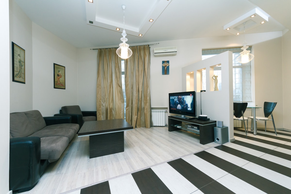 Bucură-te de priveliștile de oraș de 180 de grade din acest apartament de la etajul 22. Are un șemineu ascuns, împreună cu o bogăție de plafoniere de designer. Acest apartament este situat în cartierul Pecherskiy. Deși nu este plin de turiști, Pecherskiy este încă considerat o parte a centrului Kievului. De fapt, acest cartier oferă tot ce e mai bun din ambele perspective: te afli încă în mijlocul unui oraș animat, dar nu trebuie să te lupți cu mulțimile turistice.