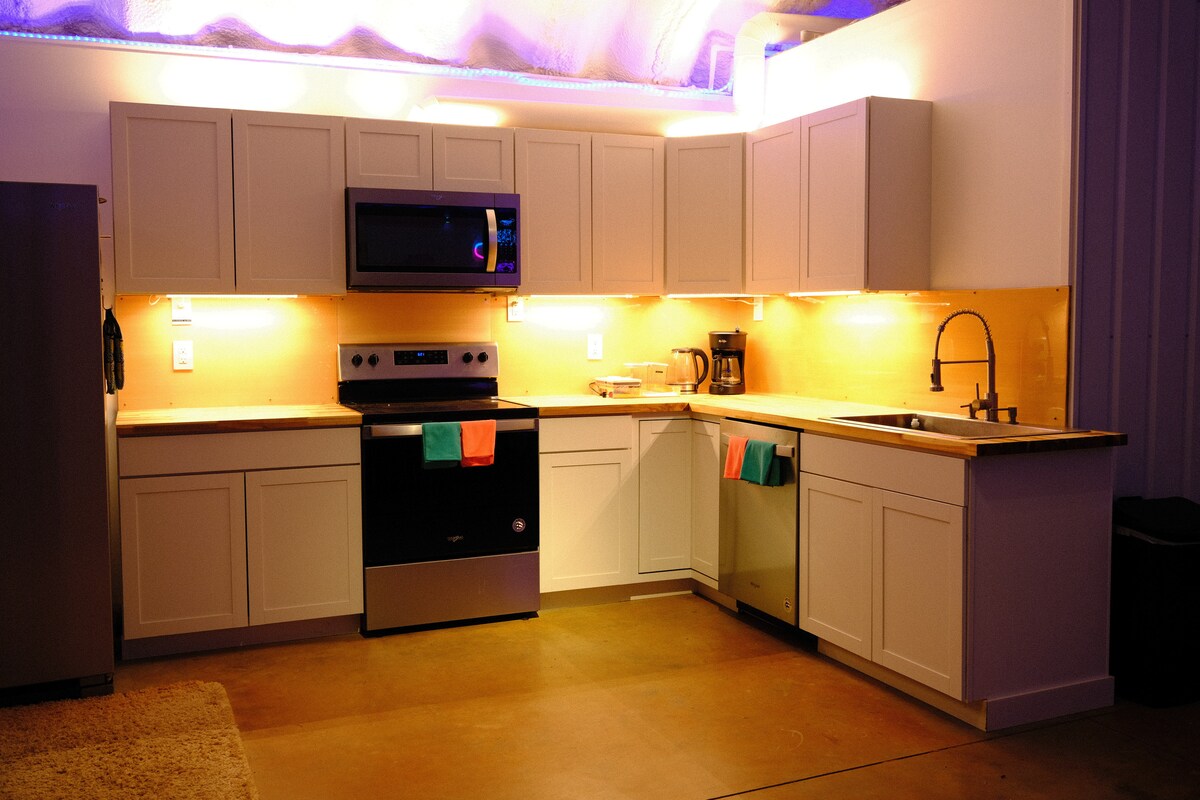 Bine ai venit la nopțile neon! Acest hangar metalic inspirat de Top Gun este evadarea ta de lux în culori vii. Relaxează-te în cada cu hidromasaj, pune un film clasic pe VHS și relaxează-te în izolare totală, înconjurat de strălucirea neonului și de designul elegant. Bucură-te de un cer plin de stele și de un șemineu în zona rurală Chesnee sau adu exteriorul înăuntru cu jocuri pe gazon și o cadă cu hidromasaj. Wifi-ul pro-speed este perfect pentru nomazii digitali sau pentru cei care fac streaming noaptea târziu. Un pat ferm și cearșafuri moi te invită să dormi.
