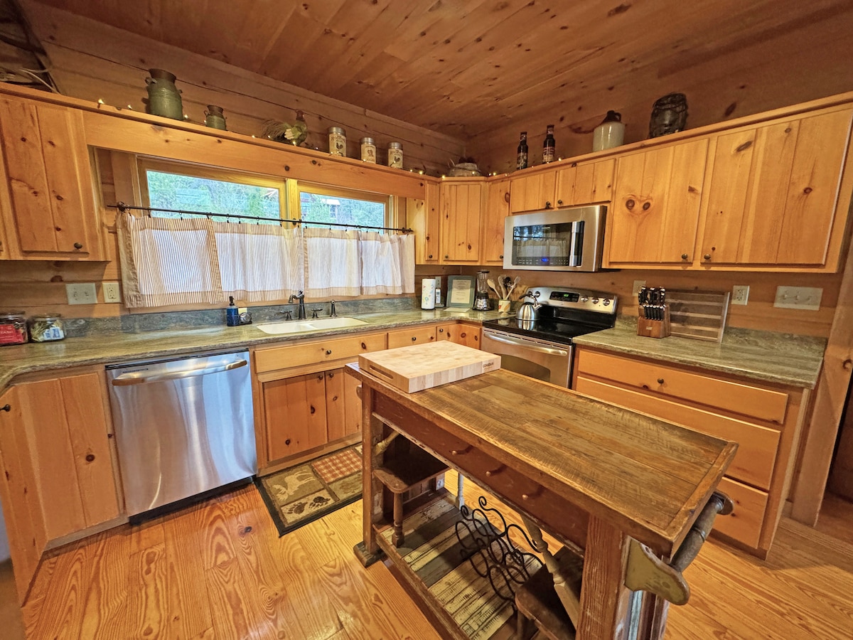 Amplasat pe 4 hectare, cu vedere uimitoare la râu și la munte maiestuoasă, cadă cu hidromasaj! Cabană frumoasă din bușteni, cu tavane cu grinzi de catedrală, cameră mare și șemineu frumos cu lemne. Bucătărie gastronomică complet utilată. Suită principală cu pat matrimonial și saltea de lux. HDTV, WI-FI cu fibră optică de mare viteză. Lenjerie de pat de designer, halate de spa și mobilier confortabil! Verandă mare acoperită și terasă deschisă cu mobilier de exterior și grătar. Priveliști spectaculoase foarte aproape de orașul Hot Springs. Evadare romantică!