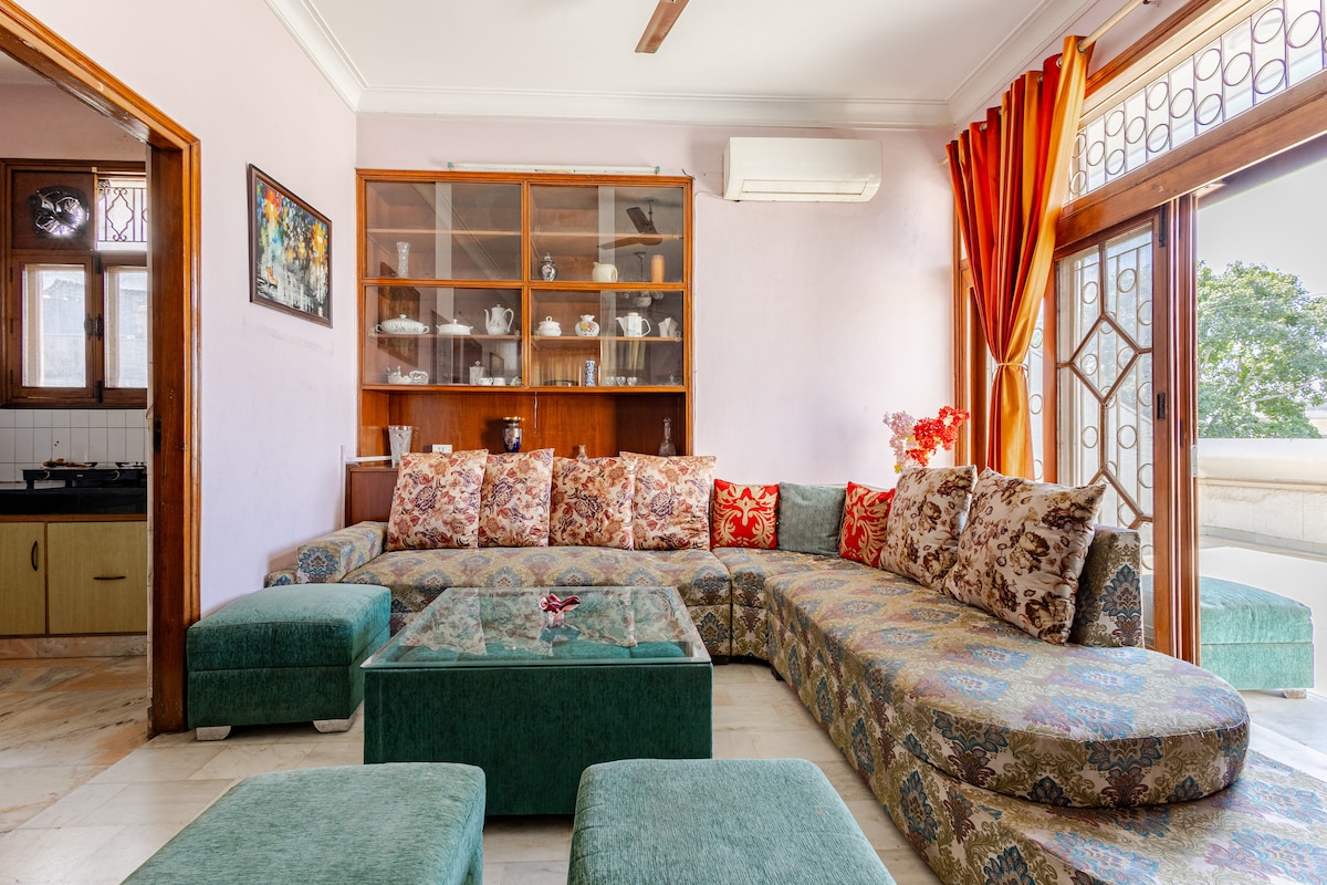 Super Locație! Serene Apartment se află în elegantul GK-1 South Delhi, aproape de 3 stații de metrou, de piața M și de magazinele convenționale. Situat lângă un parc imens, cu o sală de gimnastică,o mulțime de copaci și păsări pentru a-ți liniști sufletul. Apartamentul este plin de lumină naturală și ventilație. Există 1 dormitor+1 living (cu o canapea extensibilă mare)+balcon+ bucătărie complet utilată +1 baie+ WIFI de mare viteză. Locul este recent amenajat în stil modern. Este la etajul 2, cu acces numai la scară, este disponibil ajutor pentru bagaje.