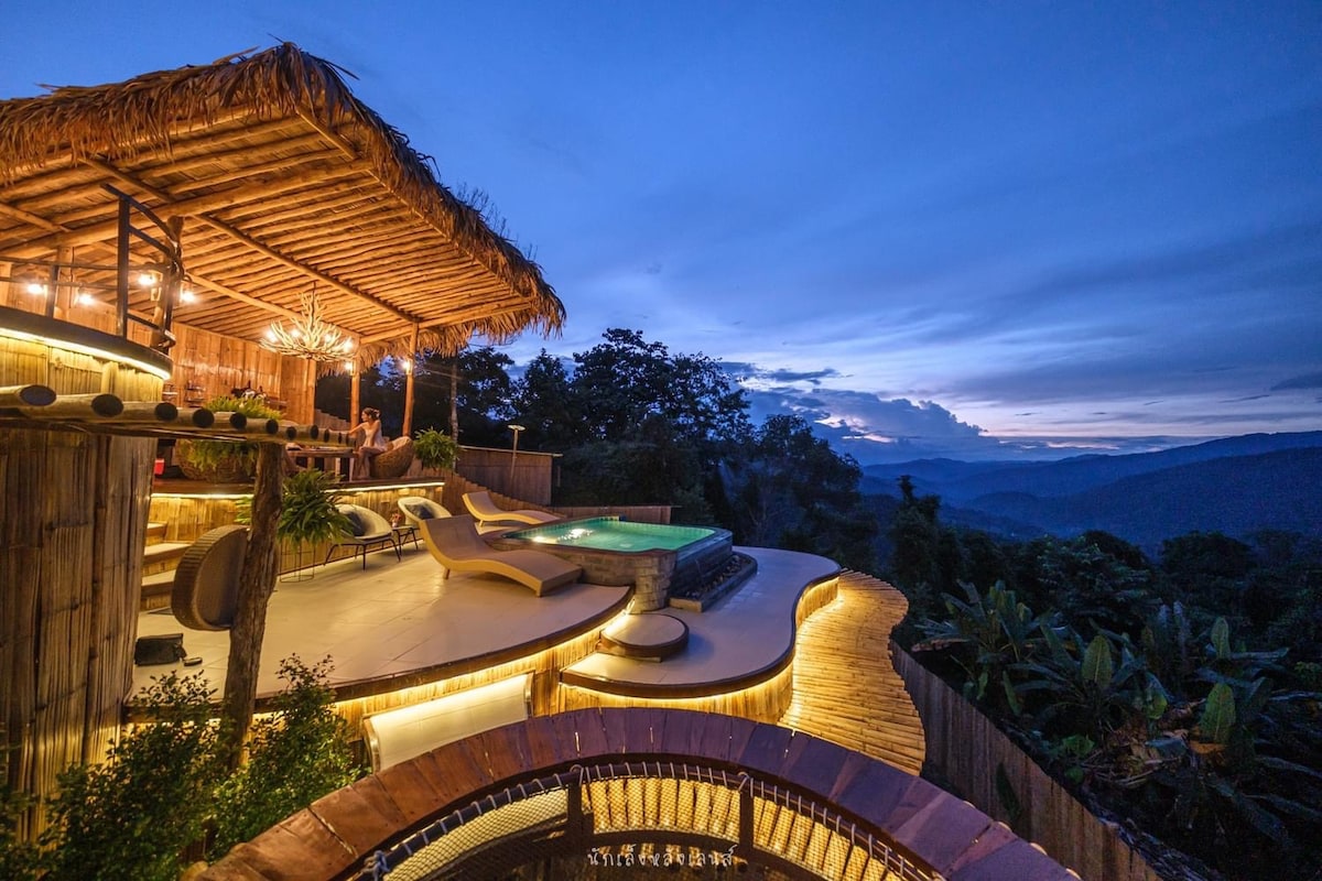 Resort&Restaurant: Wake up to in middle of the forest where mist blankets the mountains. As night falls, stargaze under a vast sky, with the distant lights of Chiang Dao village adding a magical touch. Immerse yourself in hill-tribe culture, explore nearby villages, and experience the warmth of the local community. Dine at our on-site restaurant, savoring locally sourced flavors, and unwind in the infinity pool above the sky, where panoramic views provide the perfect escape.