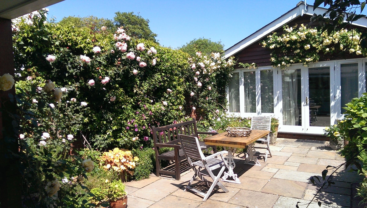 A beautiful, spacious, light and airy self contained garden studio. 3 minutes walk to Chichester town centre, with Theatre, cinemas, Pallant Gallery, Cathedral, restaurants and bars. Continental style breakfast included. FREE PARKING ON OUR DRIVEWAY, NOW WITH EV CHARGER (type 2) at extra cost. Two minutes to train station/free buses to Goodwood events. Lovely canal walks and country pubs. Great outdoor space with dining and bar area, sun umbrella and outdoor heater.