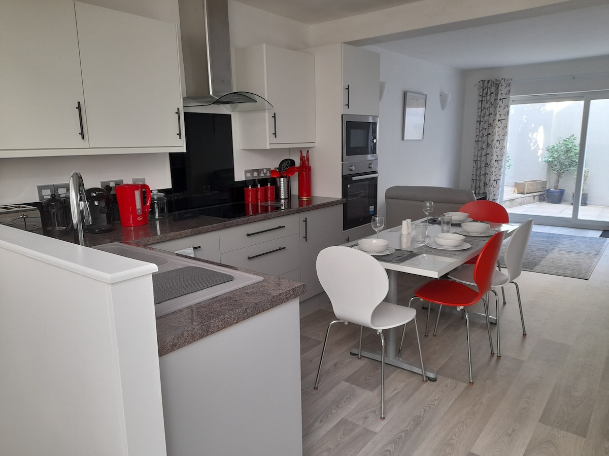 Hidden Gem este un apartament nou renovat, prietenos cu două dormitoare, la parter, cu două dormitoare, în centrul orașului Weymouth, aproape de gară și la 5 minute de mers pe jos de plaja câștigătoare a premiului Weymouth. Cu parcare privată închisă în afara străzii. Wi-Fi de mare viteză nelimitat. Bucătărie complet echipată, plită, cuptor, cuptor cu microunde, mașină de spălat vase și frigider congelator. Baie cu duș de mers pe jos și baie de sine stătătoare. Două dormitoare duble + pătuț de călătorie și spațiu de depozitare amplu. Ușile patio duc la o curte privată pentru a lua masa al fresco.