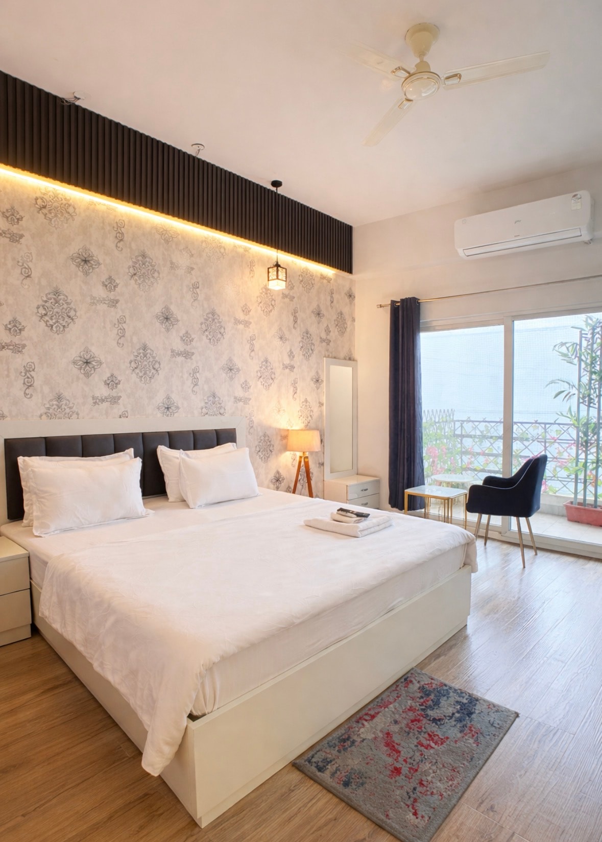 Our newly constructed 2 BHK apartment blends modern comfort with natural charm. The space features 2 serene bedroom with a queen-size beds, a spacious living room, a well equipped kitchen, 2 bathrooms: one attached to the master bedroom and another accessible from the living room and second bedroom and L- shaped balcony offering great view of the city. The property is located near a premium mall in Noida! This well-situated location offers you the convenience of shops, cafes, and entertainment.
