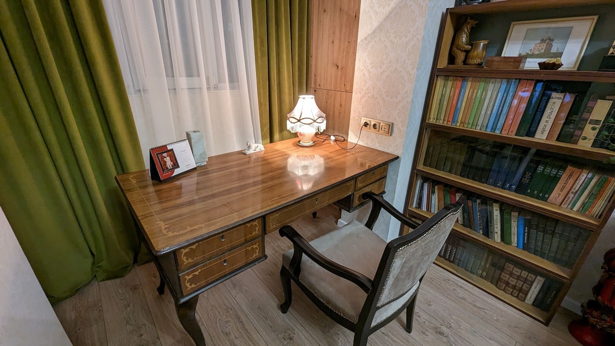 Vei sta într-unul dintre cele mai bune cartiere din Chișinău. Pentru tine - un apartament recent renovat, cu o tradiție bogată, luminos, confortabil, cu vedere la bulevard și o stradă pietonală. Check-in independent confortabil. Cheile vor fi într-o casetă securizată. Mobilier clasic din lemn natural, Wi-Fi foarte rapid, Smart TV, aer condiționat. La 3 minute (200 m) distanță - parcul central, cele mai bune restaurante, cluburi, magazine. Avem tot ce îți trebuie pentru o ședere confortabilă! Curățarea și schimbarea lenjeriei de pat/prosoapelor o dată la 7 zile.