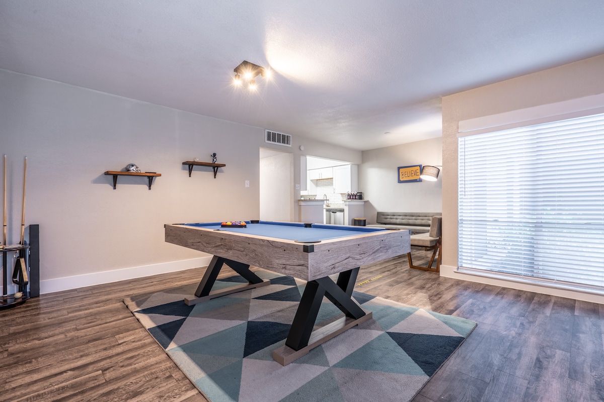 Arlington man-cave întâlnește confortul la 6 minute de mers pe jos prin parc până la stadionul AT&T, Globe Life Park sau stadionul Choctaw! Nu doar un loc unde să stai, ci să te joci! Rack un joc de biliard sau arunca unele darts în timp ce redau în flux aplicațiile tale preferate pe televizorul nostru HD de 65" 4k. Relaxează-te cu stil, cu lenjerie de pat și prosoape de lux, fiecare cameră cu TV propriu sau bucură-te de o curte privată cu jocuri de hoinărit. Apartament la parter cu un loc de parcare GRATUIT - fără condus sau taxi în ziua jocului este un adevărat bonus. 5 minute de mers cu mașina până la șase steaguri și HH!