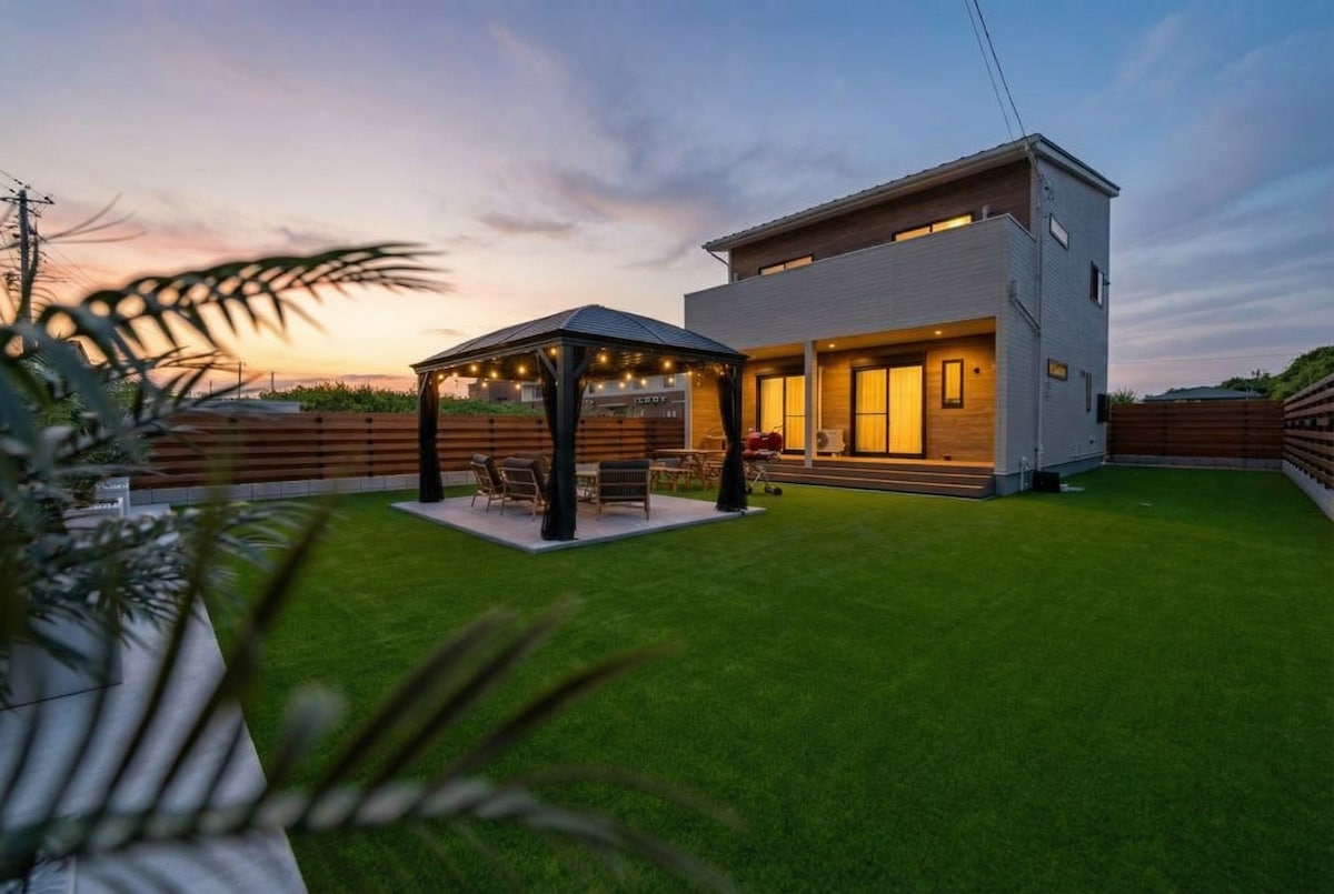 デザイナーズヴィラ、Irreplace-イルプレイス。 プチサッカー、バドミントン、などのアクティビティが可能な広いお庭を完備。 雨天対応型のBBQスペースに加え、サウナ、ジャグジーもあるので、小さい子供~子大人まで、全員が遊び尽くせる施設です。 一番のこだわりは、お庭をフェンス&塀で囲っているので、やんちゃ盛りのお子様もお庭で安心して遊ばせられる点です。 寝室は4部屋。10人前後のグループや、3~4家族様でも各ご家族のプライバシーを守りながらお過ごしできます。 ご家族や仲間とのかけがえのない時間お過ごし下さい。 ※バレルサウナの利用は追加1万円がかかります。 ※ペットは、家具を傷つけないなど、躾の出来た小型犬のみとなります。1頭3000円の追加費用となります。ワンちゃんグッズはございません。 ※一宮町の条例により、お庭の利用は21時までとなります。。それ以降は室内でお楽しみ下さい! ※施設内のお庭は人工芝のため、花火は禁止です。フェンスを開けた隣の砂利エリアで焚き火と花火は可能です。 ※大声や掛け声、大きな音楽など大騒ぎとみなされる行為は禁止です。