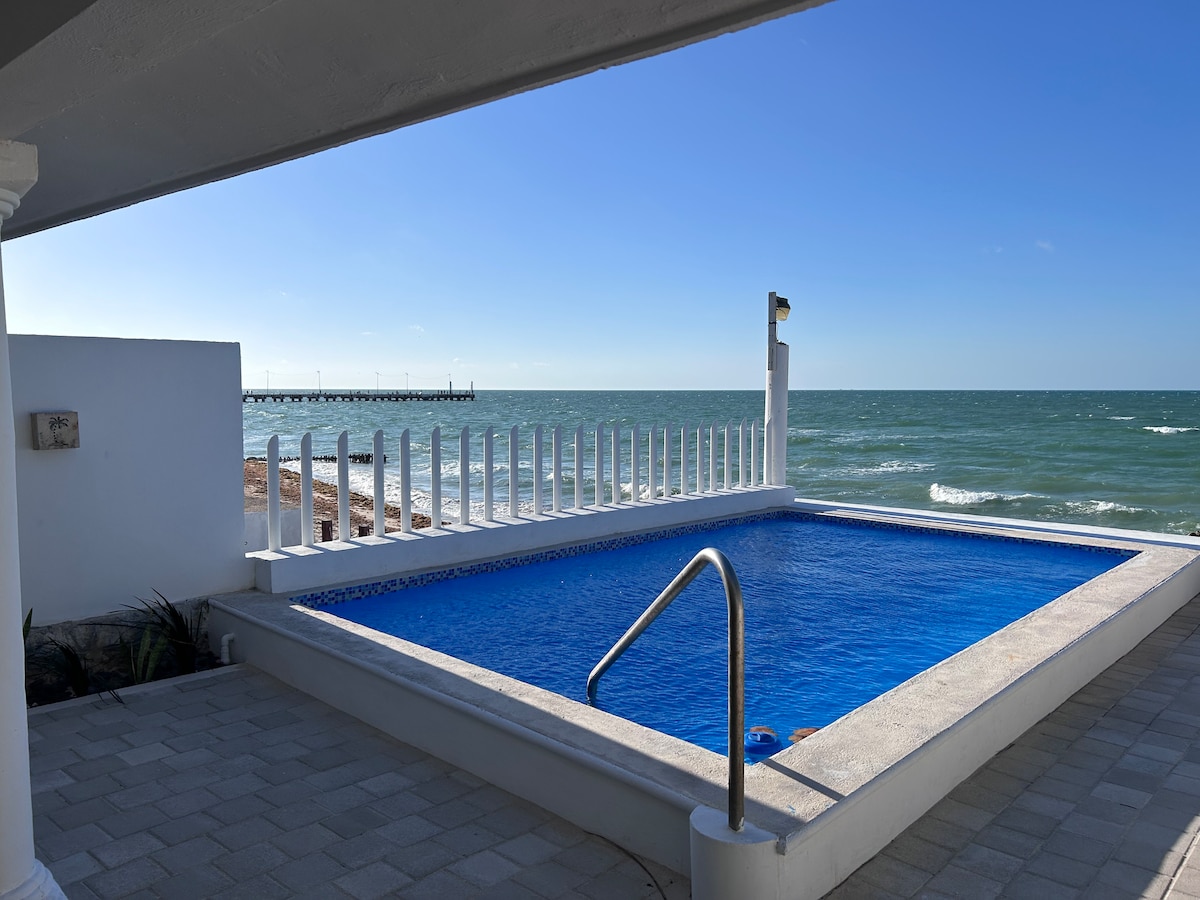 Stylish architecture house with 2 floors, plus rooftop. 3 bedrooms with ocean views & their own private full bath: 1 bedroom on ground floor, and 2 bedrooms on the 2nd floor. Swimming pool with a view of the ocean. Backyard has many palm trees. Discounts with weekly & monthly. 3min to Farmers Market 3min to Bistro Maasai 4min to Sayab Bistro 5min to Gym 5min to Oxxo 9min to Cafe France 10min to Molusk 14min to Isla Columpios 15min to Progreso