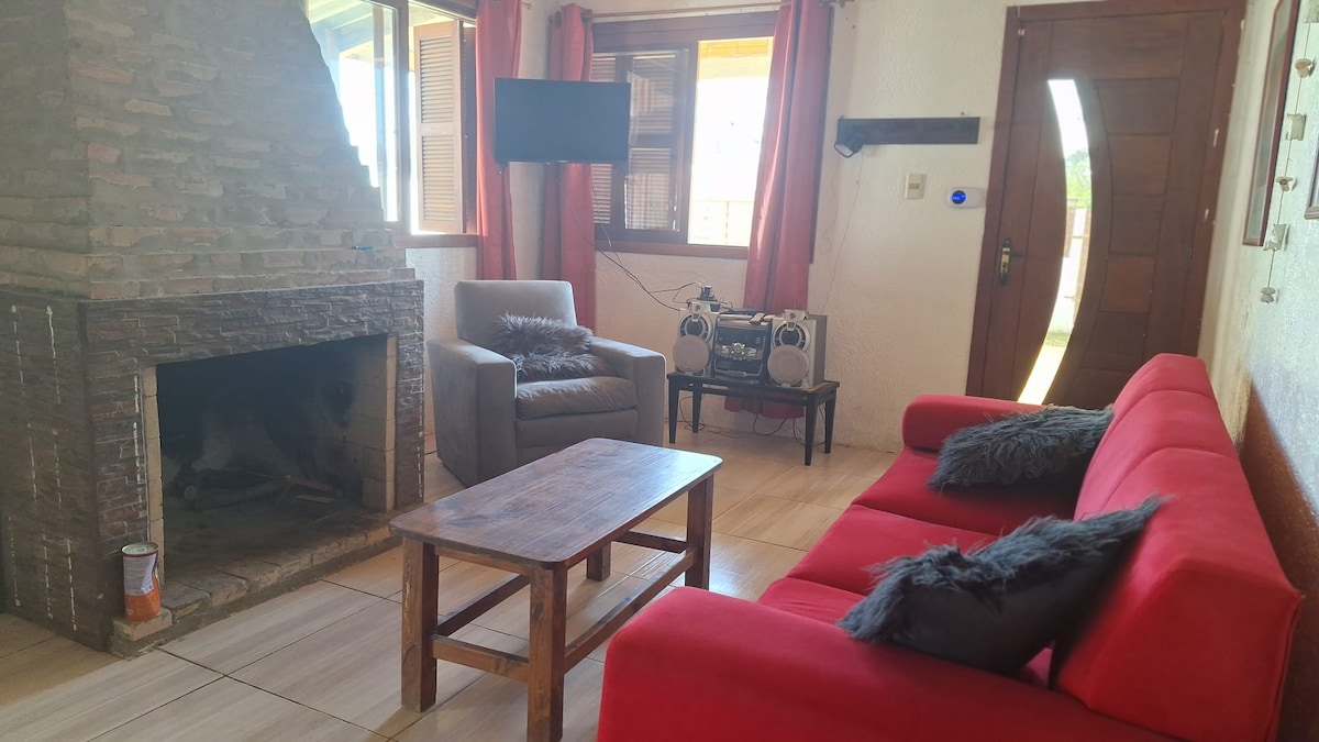 Sobrado próximo à praia (300m), com infraestrutura aconchegante para curtir tbm dias de inverno, em frente a lareira. O espaço foi pensado para descanso ou trabalho, sendo a parte superior bastante silenciosa, iluminada e vista para o mar. Alpendre amplo, com espaço para jogos (disponível mesa de ping pong), redes, cadeiras de descanso, churrasqueira e parrilla. Possui brinquedos e jogos infantis para que os dias sejam ainda mais prazerosos. Aceita Pets. Acomoda com privacidade e integração.