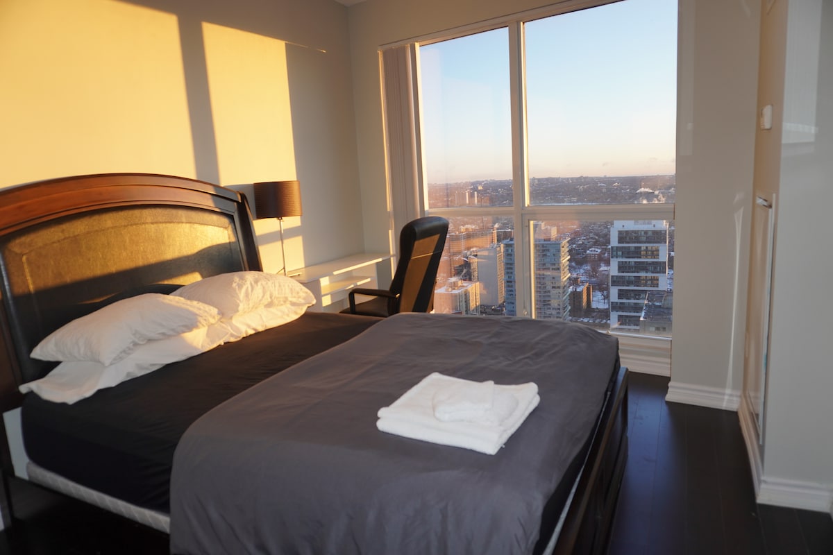 Apartamentul nostru spațios 2BR este situat în inima orașului Toronto, cu vedere panoramică la orizont și CN Tower. Unitatea este perfectă pentru vizitatori internaționali, familii și persoane care călătoresc în interes de afaceri. ➜ Situat la 1 minut de mers pe jos de stația de metrou College/Yonge ➜ Acces ușor la CN Tower, Metro Toronto Convention Centre, Rogers Centre, Scotiabank Arena, Union Station ➜ Vedere la Turnul CN Check-in independent➜ NON-STOP ➜ 1 loc de parcare GRATUIT Scor de➜ mers pe jos de 100 - Excelent! Scor de➜ tranzit de 100 - Excelent!