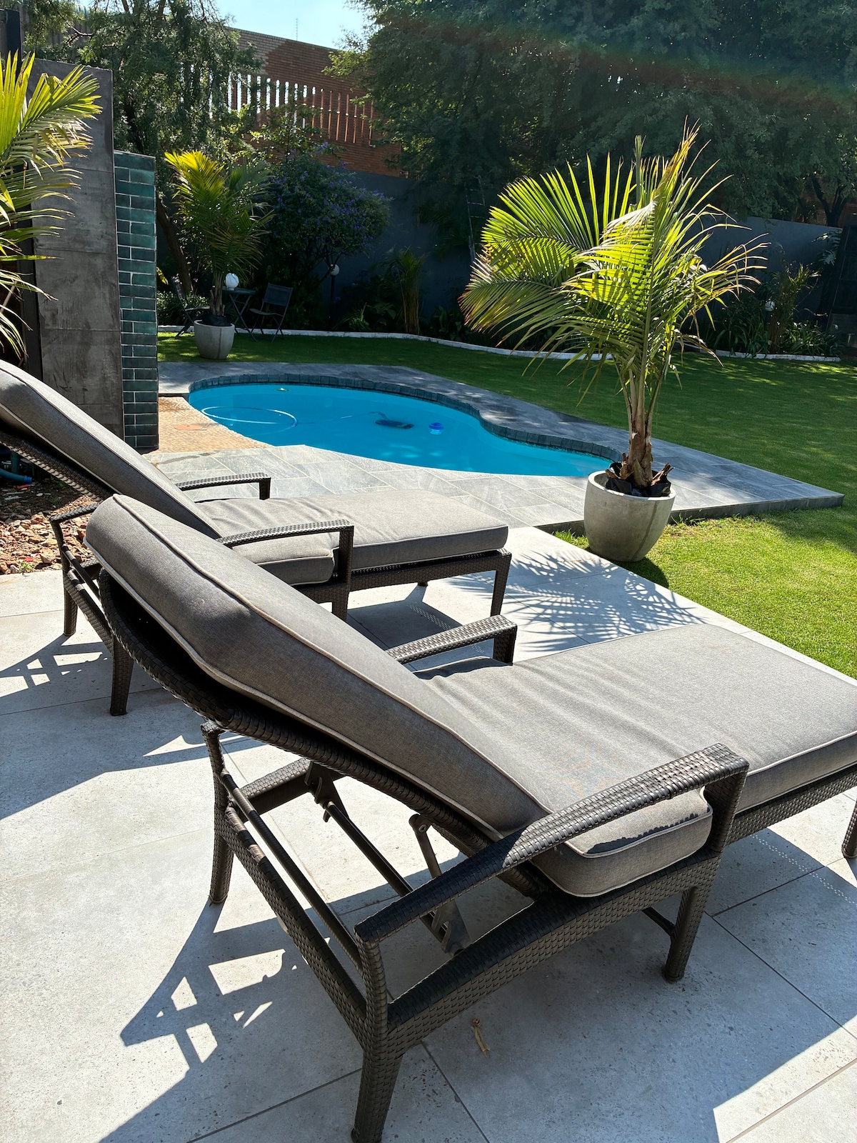 Complet mobilat în afara cabanei . Fiber Wifi , Dstv , baie de duș cafea ceai biscuiți cu lapte băuturi răcoritoare și cereale pentru micul dejun în chicinetă Piscină disponibilă , grădină separată cu mobilier . Masă de toaletă în baie . Pernă nouă pe pat Parcare sub acoperiș cu poartă de securitate. Escortă de securitate pentru sosiri noaptea târziu, dacă este necesar. Două case rutiere pentru a lua alimente cu o rază de 1 km. Suntem la 6 km de Aeroportul OR Tambo .ast Rand Mall și alte mall-uri sunt toate la 4 km