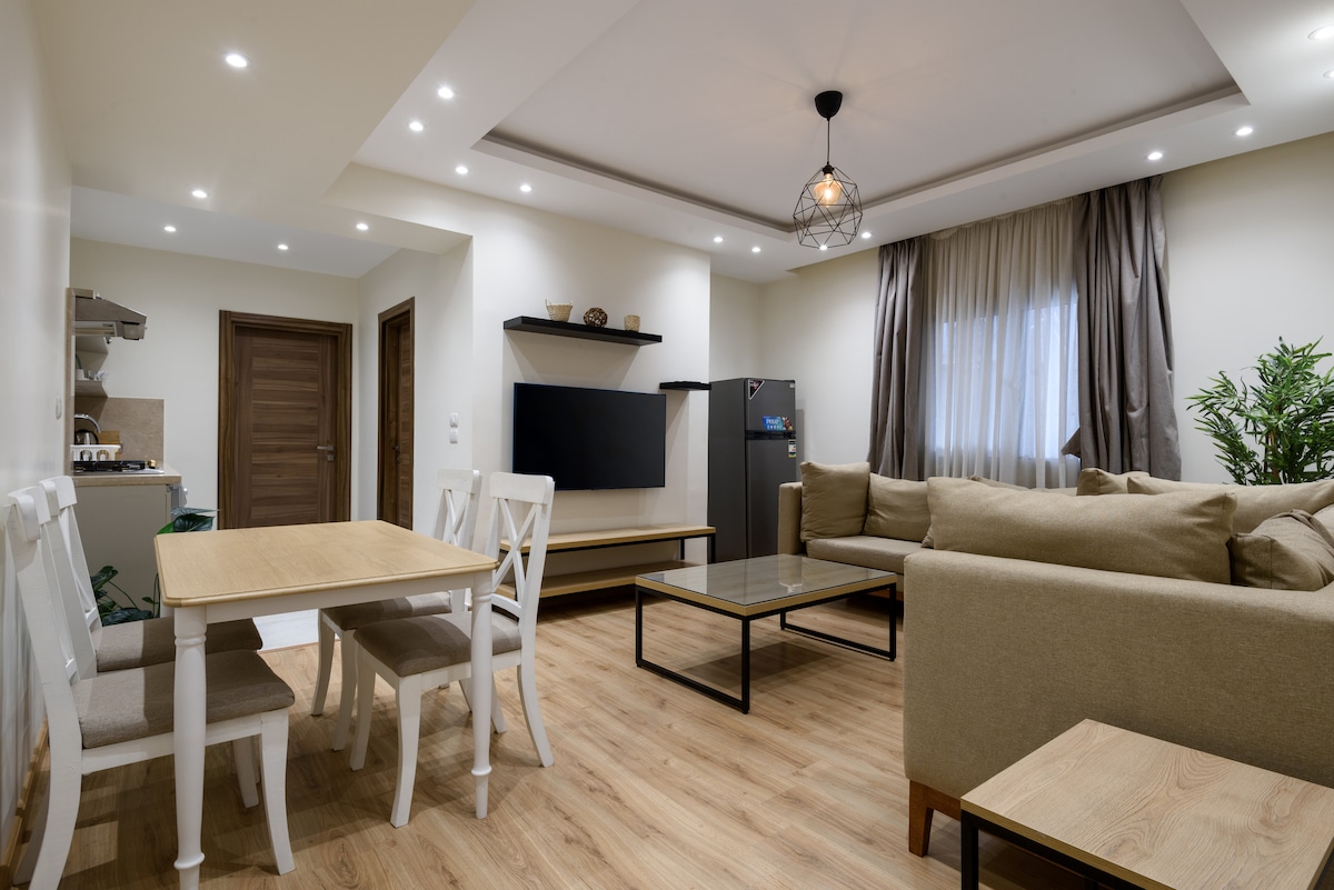 Experience the ultimate in modern comfort in our new 2-bedroom and 2-bathroom apartment suitable for 4 persons,Every inch of this stylish space is new and designed to make your stay unforgettable Our apartment is perfect for families or a business trip. You’ll find all the amenities you need, including a fully equipped kitchen, a comfortable living area Located in a prime compund, you’re just a short way from restaurants,shops in tagamoa and naser city Book now,,We can’t wait to host you!