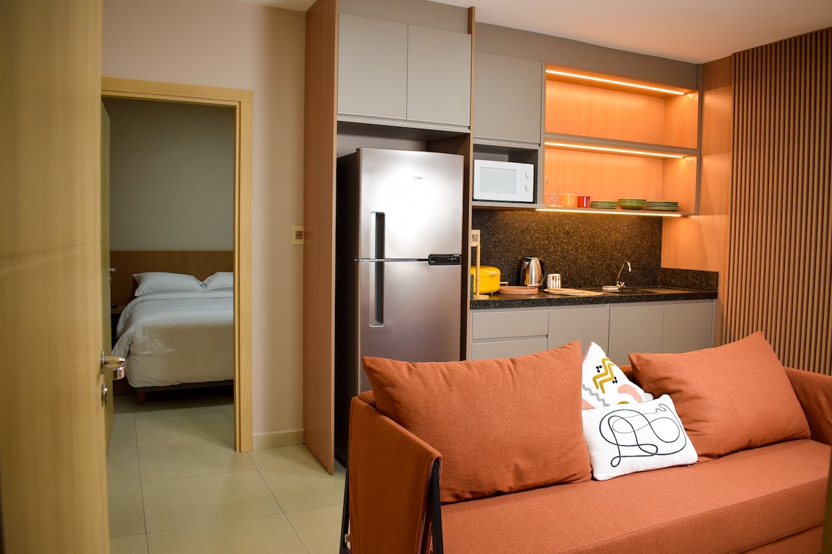 Bienvenidos a una experiencia única en el mejor punto de la ciudad. 🛏️ Dormitorio: Cama de alta calidad, iluminación acogedora y diseño moderno. 🛋️ Sala de estar: Sofá cómodo, Smart TV con acceso a plataformas de streaming y grandes ventanales que llenan el espacio de luz natural. 🍽️ Cocina totalmente equipada para cocinar como en casa. 🛁 Baño completo: Ducha con agua caliente, toallas suaves y artículos esenciales de higiene.