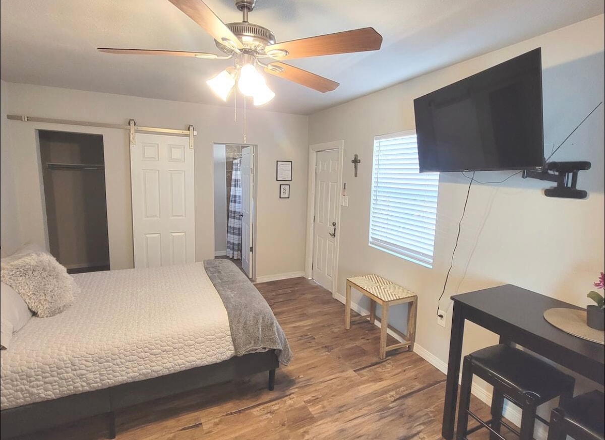 Bucură-te de șederea ta în această casă de oaspeți confortabilă, liniștită și recent renovată. Această casă de oaspeți uimitoare este situată central în El Paso, într-un cartier sigur și prietenos. Aici vei fi înconjurat de viața de noapte din El Paso, de restaurantele rafinate, de cel mai mare parc memorial emblematic al orașului, de sport și de divertisment de familie. Toate la doar 5-10 minute distanță și acces ușor la I-10. Vei putea să te bucuri de o odihnă de noapte excelentă pe cel mai confortabil pat matrimonial pentru a te relaxa uitându-te la televizorul inteligent situat în dormitor.