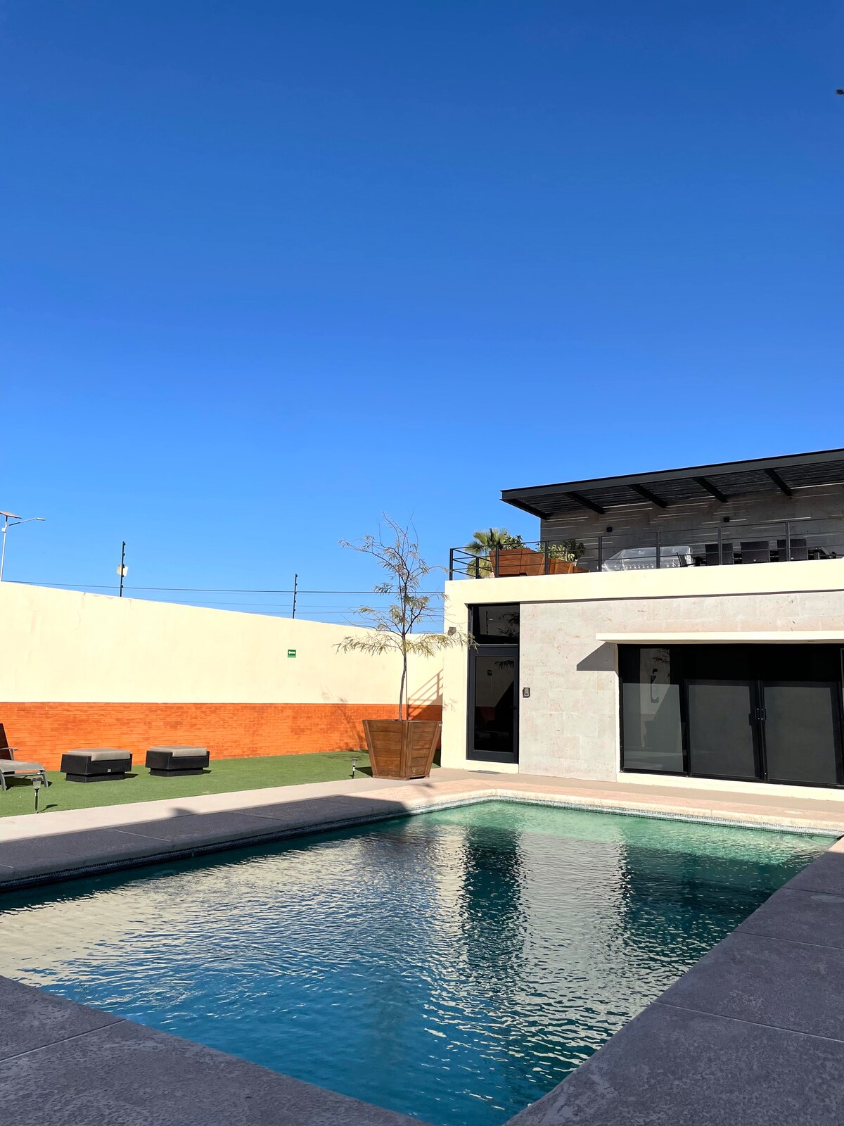 Diviértete con toda la familia en este alojamiento completo y con estilo. Agradable ambiente, muy seguro, terraza con vista al Estadio Yaquis Entrada controlada, vigilancia 24/7 Camaras de seguridad, 2 pantallas de TV de 65” con Netflix Prime Equipo de sonido en terraza y jardín Refrigerada y con calefacción Muebles elegantes y modernos, bar con barra de granito Escalera de Madera con cristal templado, cocina equipada, cafetera Nespresso Cuarto de lavado Patio Fogata y garaje cubierto.