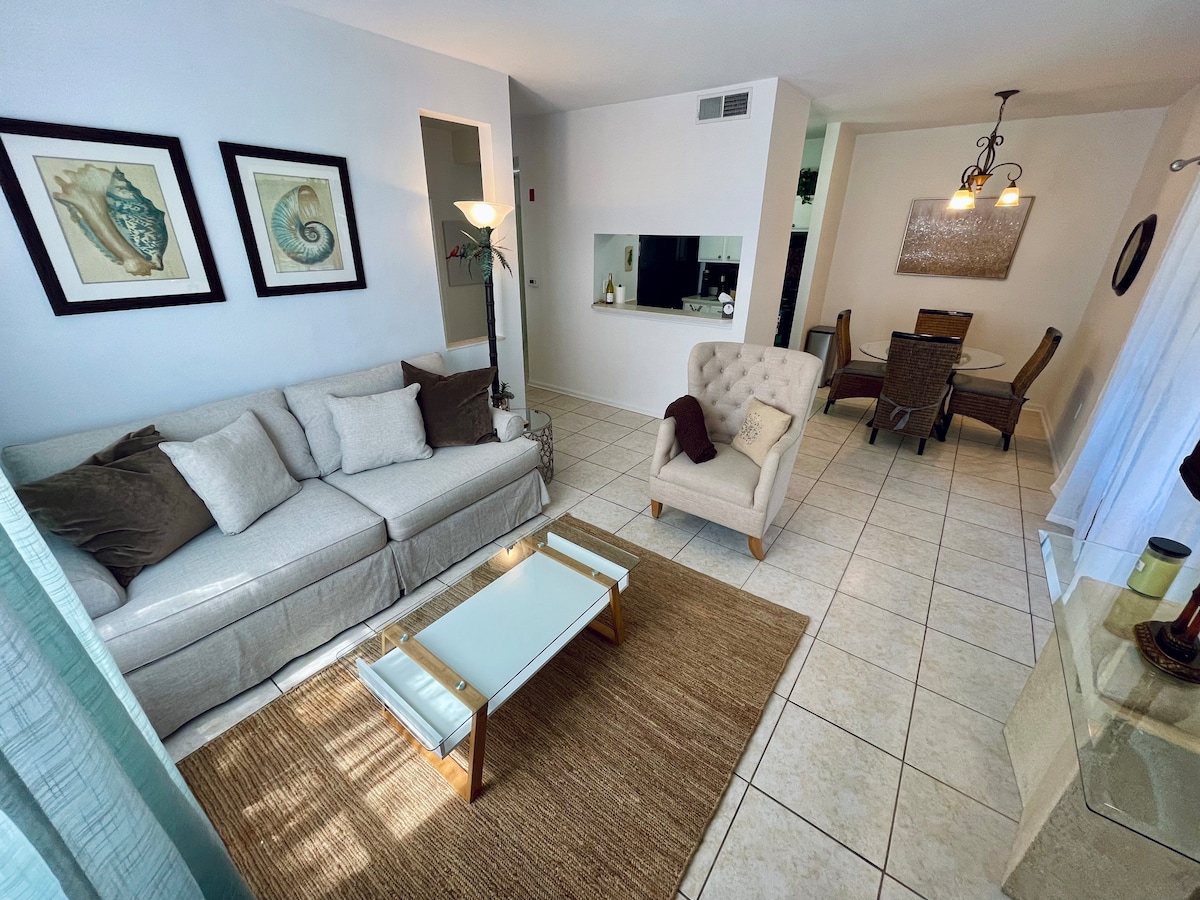 Bucură-te de o escapadă în acest apartament relaxant, curat, luminos și confortabil, cu 1 dormitor/1 baie, la etajul 1 al unei comunități închise, complet echipat pentru șederea ta, inclusiv scaune de plajă, umbrelă și un răcitor. Vei avea o intrare privată în apartament, parcare gratuită, o piscină încălzită deschisă tot anul, un club cu o sală de gimnastică de bază. Ne aflăm convenabil la 15 minute de plaja Clearwater și la 30 de minute de mers cu mașina de Aeroportul Internațional Tâmpa.