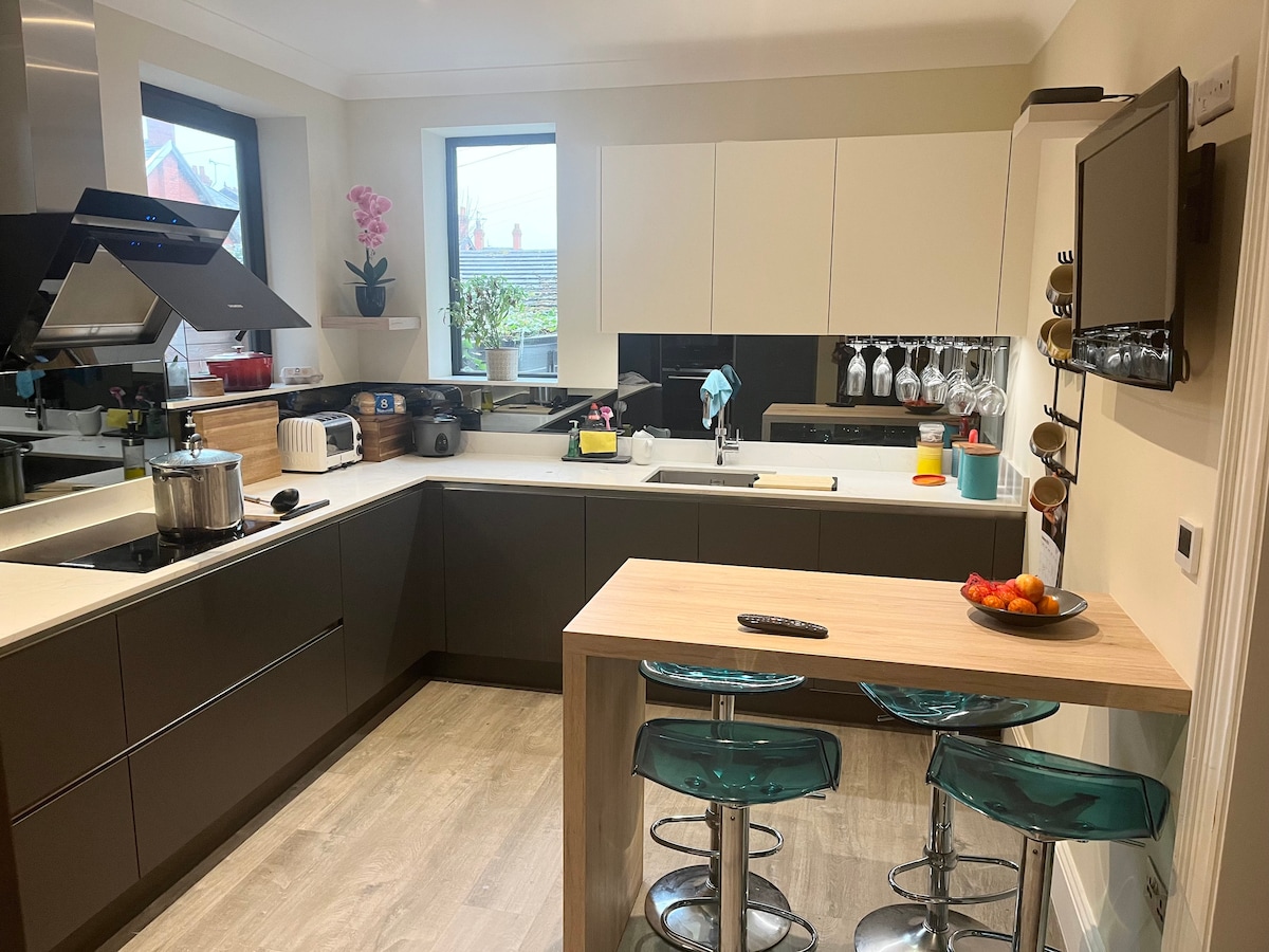 Bucură-te de o experiență elegantă în această casă spațioasă din inima orașului Poulton-le-Fylde. Casa modernă, amplasată lângă gară, este bine echipată cu tot ce ai nevoie pentru a te bucura de ședere. Cu 3 dormitoare, 4 băi, o terasă privată la ultimul etaj și un balcon în față pentru a prinde tot ce este mai bun de la soarele de după-amiază. Toate dormitoarele au televizoare cu acces la Sky, Prime și Netflix. Poziția sa fantastică se află la câțiva pași de toate restaurantele, barurile, supermarketurile și gara.