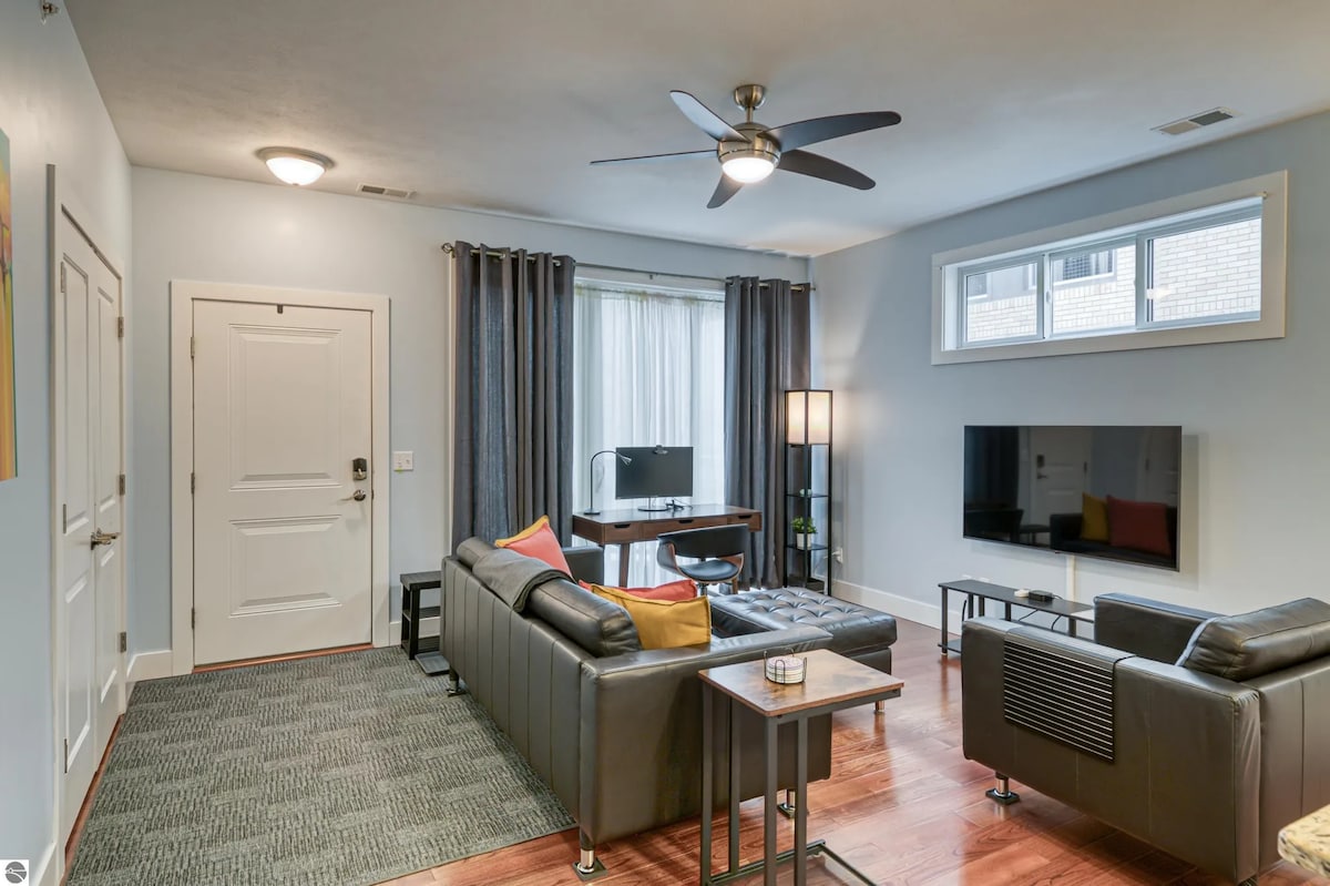 Cea mai bună poziție din centrul orașului și direct peste drum de restaurante, magazine, fabrici de bere și plajă. Parchează-ți mașina și mergi peste tot în câteva secunde! Include propriul patio privat! Apartament nou, modern, în mijlocul orașului Traverse City. Unitate unică, elegantă, care are propriul tău patio privat și spațiu de lounge, parcare privată, internet de mare viteză, Smart TV și cablu și cafea.