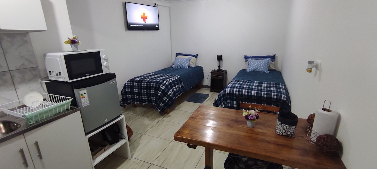 Apartament studio pentru două persoane, cu baie privată și intrare independentă. Încălzire centralizată (pardoseală cu tacâmuri radiante). Baie confortabilă și spațioasă, ideală pentru persoanele cu mobilitate redusă. Situat într-un cartier liniștit, aproape de punctele de interes turistic, între două dintre bulevardele principale din Punta Arenas. Pub-uri, restaurante și cafenele în apropiere. Supermarketuri , magazine de fructe și brutării în zonă. De asemenea, avem câteva biciclete pe care oaspeții le pot utiliza.