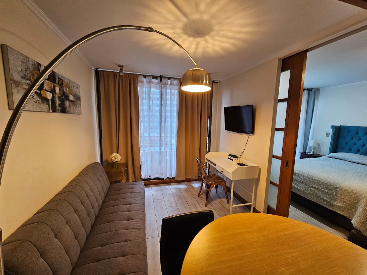 Studio frumos, confortabil, în zona cea mai exclusivistă a orașului Santiago și zona strategică a Las Condes. La câțiva pași de supermarketuri, magazine, servicii și mijloace de transport. Ideal pentru oaspeții care vizitează orașul pentru întâlniri de afaceri, turism și medicale. Acest apartament are un boiler electric pentru apă caldă. Internet 5G. Încălzitor electric și ventilator, în funcție de sezon IMPORTANT: dacă ai nevoie de parcare, te rugăm să verifici dacă are o mică valoare suplimentară înainte de rezervare. Mulțumim:)