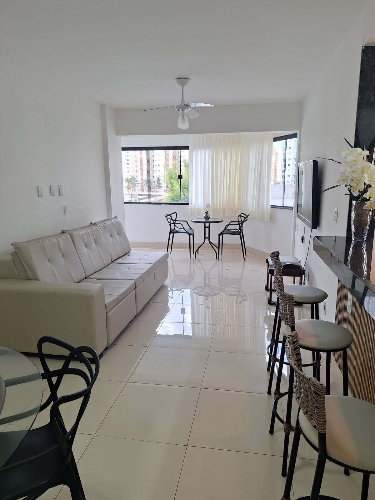 Bem localizado e seguro. É Rigorosamente higienizado c/ preservação da segurança e da privacidade das famílias. Apto 3 quartos, sendo 1 suíte c/ cama de casal, sala c/ cozinha americana, varanda c/ mesa, lavabo, 1 quarto com cama de casal, 1 quarto com 2 camas de solteiro, + 3 colchões extras , mesa de jantar com 6 cadeiras, sofá grande, ar condicionado nos 3 quartos, TV, fogão, geladeira, forno, mobília completa e área de lavanderia. Equipado p/ receber 9 pessoas (permitidos no condomínio)