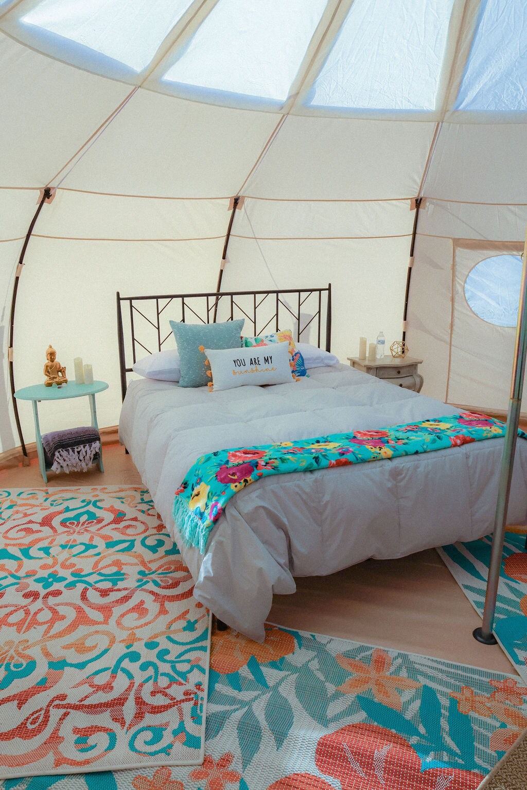 The Bend este o oază în AFARA REȚELEI, în dealurile munților Anza-Berrego. Amplasat între Palm Springs & Wine Country. Acest cort Shabby Chic se află în zona noastră de OAZĂ. Un cort cu bec cu pânză de 20'cu tavan clar pentru PRIVITUL STELELOR. Cu saltea Queen Size organică, cearșafuri din bambus, huse, pătură de vafe și mângâietor în jos. Toaleta cu jet de compostare privată se află chiar în fața cortului. Oaza oferă 360 de grade de peisaj uluitor! Alătură-te nouă pentru escapada, petrecerea sau evenimentele tale private