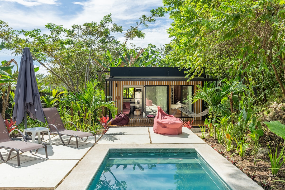 Bine ai venit la Casita El Mañana Evadează în casita ta privată din junglă, cu o piscină strălucitoare cu apă sărată și o zonă exterioară luminoasă, recent modernizată, cu șezlonguri, taburete puf colorate și o umbrelă mare. Înconjurat de verdeață tropicală luxuriantă și o terasă acoperită, acesta este complet echipat cu aer condiționat, Wi-Fi rapid și parcare securizată. Terasa și grădina sunt perfecte pentru yoga, meditație sau pentru a te bucura de soare. La doar 5 minute de Playa Hermosa și la 15–20 de minute de plajele din Santa Teresa - o escapadă tropicală perfectă