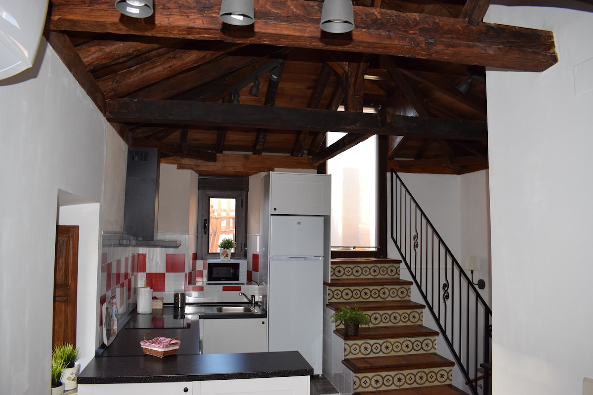 Primul etaj are un living spațios și luminos, cu o canapea confortabilă, un televizor, o bucătărie complet echipată și deschisă și o masă mare. Baia este dotată cu un duș mare și apă caldă instantanee. Dormitorul de la parter este mobilat cu o garderobă încorporată și are grinzi uimitoare din lemn. Etajul superior vei găsi al doilea dormitor cu acces la o terasă privată mare, ideal pentru cupluri și prieteni să se relaxeze și să se bucure de un pahar de vin în timp ce admiri priveliștile magnifice ale orașului Toledo.