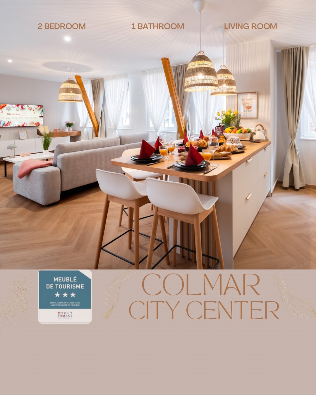 În inima centrului orașului Colmar, în cartierul Triunghiului de Aur, apartament Haussmann de 100 m2 cu tavane înalte de 3,30 m, situat la etajul 1 al unui conac cu vedere la parcul Champ de Mars. Nu există lift. Clasificare de 4 stele de către Prefectură. Parcare inclusă (acoperită și monitorizată vizavi de apartament). Animalele de companie sunt permise numai prin rezervare și contra participării financiare (tarif fix de 20 €).
