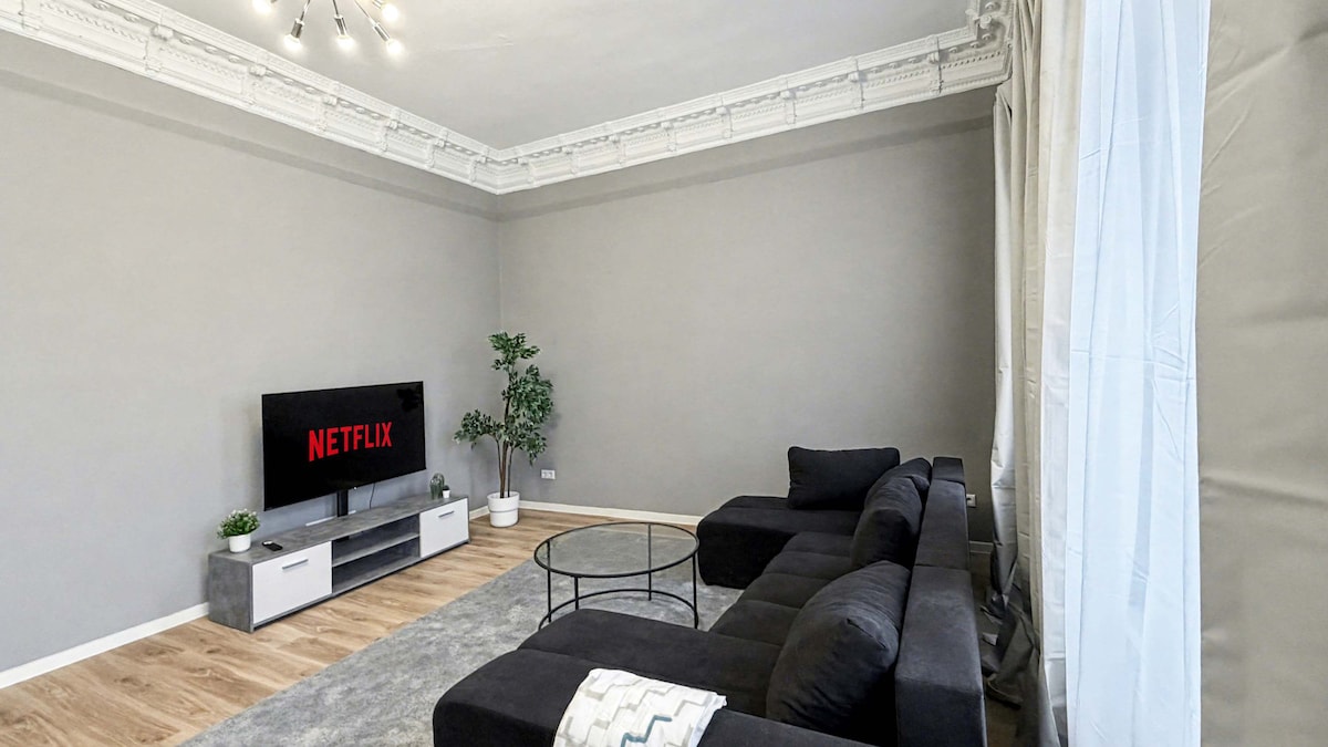 Willkommen in unserem luxuriösen, denkmalgeschützten 120m² Apartment in Krefeld: → 3 große Kingsize-Doppelbetten → 2 Balkone → Schlafsofa für 7. & 8. Gast (jeweils 180cm lang). Das Wohnzimmer ist en-suite zum 2. Schlafzimmer. Zwischen den Räumen gibt es keine Türe. → Super zentral, direkt in der Innenstadt → Smart-TV & NETFLIX → NESPRESSO-Kaffeemaschine → große Küche und Essbereich