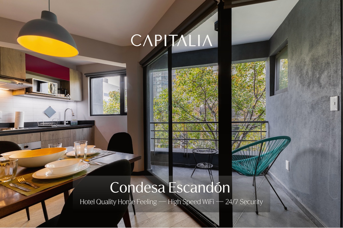 Apartament luminos la etajul 7 (nivel superior), cu balcon și vedere la oraș și Río Becerra–Viaducto Miguel Alemán. Acesta are 2 dormitoare cu dulapuri spațioase, un living și o zonă de luat masa, bucătărie utilată, baie și ferestre din podea până în tavan. Televizoare inteligente (50"și 24") cu Netflix, Prime și YouTube (oaspeții se conectează la propriile conturi). Include Alexa, frigider, cuptor cu microunde și aparat de cafea. Accesul pietonal în clădire are aproximativ 10 trepte. Ideal pentru o ședere confortabilă, bine conectată.