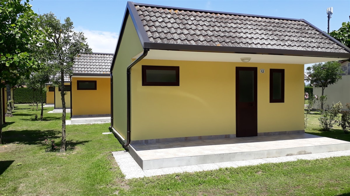 Bungalou cu un dormitor (pat dublu, pat supraetajat,dulap, set complet de cearșafuri) baie(toaletă,chiuvetă,duș,uscător de păr, 2 prosoape mici, 1 rolă de hârtie igienică, 1 săpun de mână) bucătărie completă (frigider,chiuvetă, plită cu gaz,masă 4 scaune, măsuță de cafea în aer liber, veselă/tacâmuri complete), A/C,consum inclus, TAXĂ SUPLIMENTARĂ PENTRU ANIMALE DE COMPANIE 25,00 € Taxă de cazare 1,00 € pe zi de persoană scutită sub 12 ani. Plajă la mt300, supermarketuri și restaurante la 200 de metri.