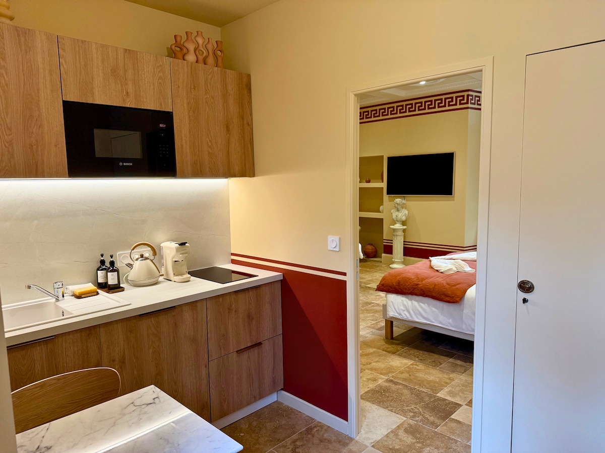 În inima orașului Dinan, lasă-te transportat de eleganța Romei antice. Relaxează-te într-un apartament de lux cu un balneo privat🛁. Bucură-te de confortul unui pat matrimonial cu lenjerie de pat de 🛏️hotel, bucătărie utilată, TV conectat cu Netflix, WiFi cu fibră optică și o terasă intimă. La o aruncătură de băț de Turnul cu Ceas și pitorescul Jerzual. Parcare, restaurante și magazine în apropiere. Totul se îmbină pentru o escapadă romantică de neuitat❤️.
