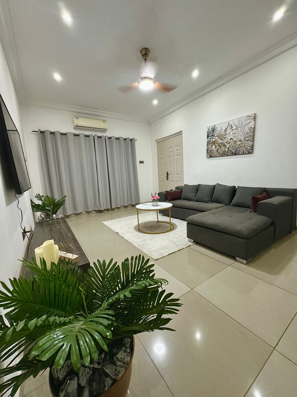 Relaxează-te cu întreaga familie în acest loc liniștit de cazare. Proprietatea noastră este situată convenabil în Community 26, Tema, în largul N1 (Extensia autostrăzii), în spatele Community 25 Palace Mall . Zona se mândrește cu o gamă largă de magazine, restaurante și servicii la câțiva pași. Fiecare dintre cele opt unități este complet mobilată și echipată cu trei unități LG AC, o mașină de spălat rufe, aparate din oțel inoxidabil, trei ventilatoare, paturi matrimoniale confortabile, precum și ustensile de bucătărie și de luat masa. Parcare gratuită.