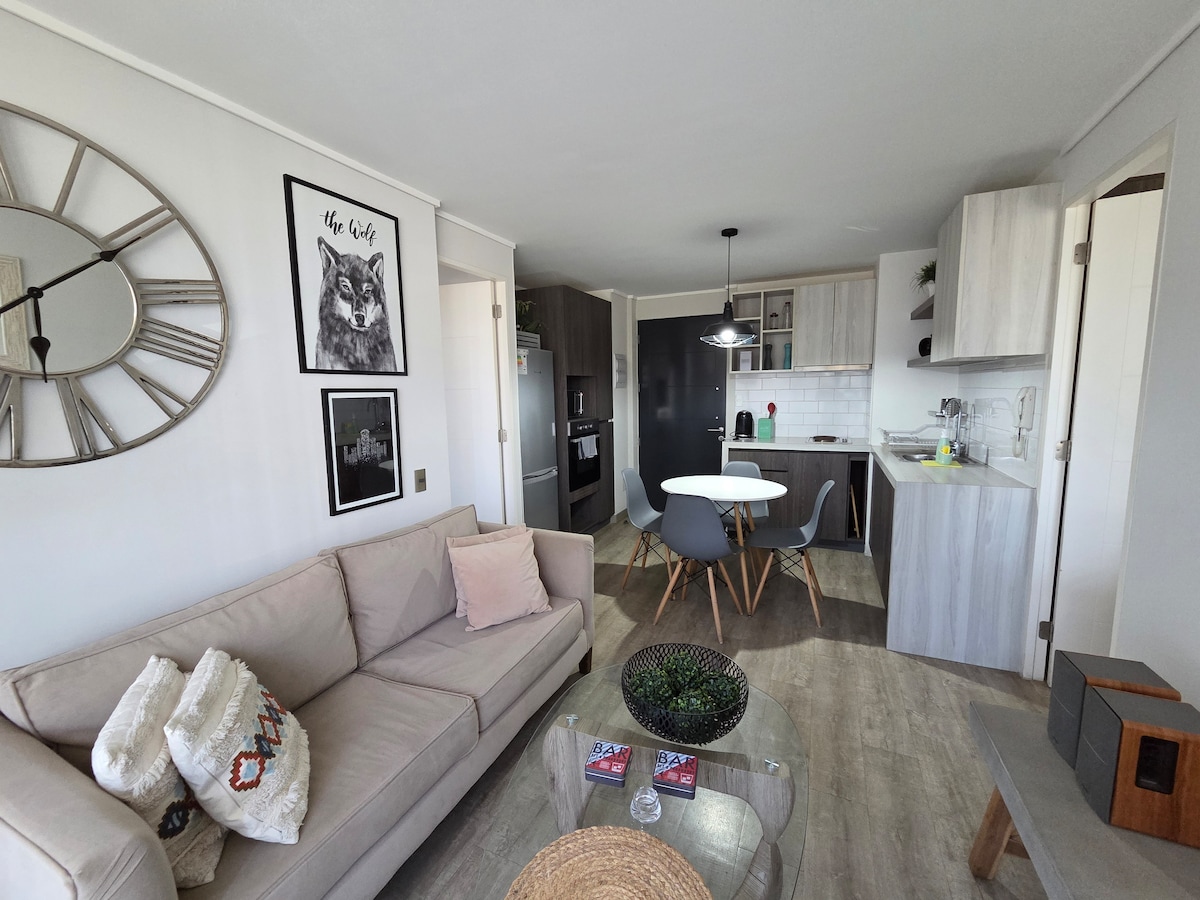 Apartament confortabil, cu tot ce trebuie pentru o ședere plăcută. Conectivitate excelentă cu toate comunele din apropierea Gran Concepción. Concierge non-stop. Aproape de universități. O să vă placă la nebunie! Vino să ne cunoști 😊