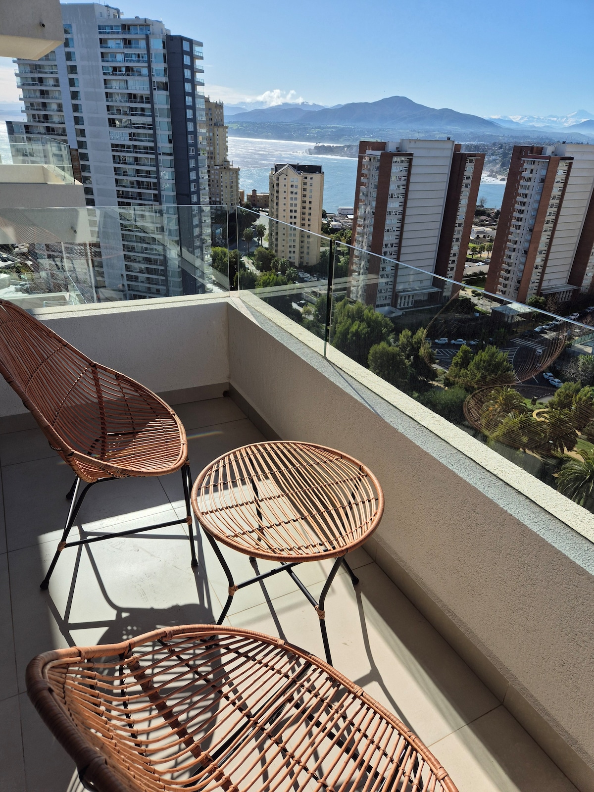 Apartament nou situat în cartierul exclusiv Con Con, Costa de Montemar. Apartamentul este mobilat și complet utilat cu acces la internet, piscină, sală de gimnastică, închiriere saună, parcare privată și are o vedere panoramică spectaculoasă. Există supermarketuri și locuri de cumpărături la mai puțin de cinci minute distanță și este situat la 100 m de dunele con, ideal pentru două până la trei persoane, ceea ce este perfect pentru divertisment și odihnă.