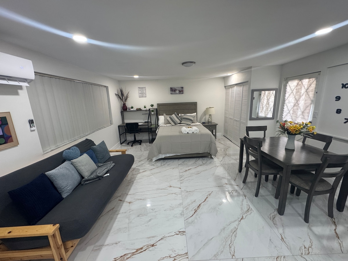 Studioul privat de lux cu intrare privată (440 ft ² poate găzdui 3 persoane/2 mașini) este atașat la casa noastră și la 1,7 mile de plajă și adiacent la Ft Lauderdale. Parchează sub carportul acoperit. 1 pat matrimonial (și 1 saltea Queen Size-Blow Up), 1 baie, chicinetă, Wi-Fi cu fibră optică, TV cu ecran plat (140 de canale), ferestre de impact, dulap imens, ventilator/lumină, aer condiționat cu telecomandă, birou, scaun, masă pliabilă pentru a mânca w/ scaune, frigider mic, cuptor cu microunde, cuptor cu prăjitor de pâine, grătar Foreman, aragaz cu apă caldă, filtru de cafea.