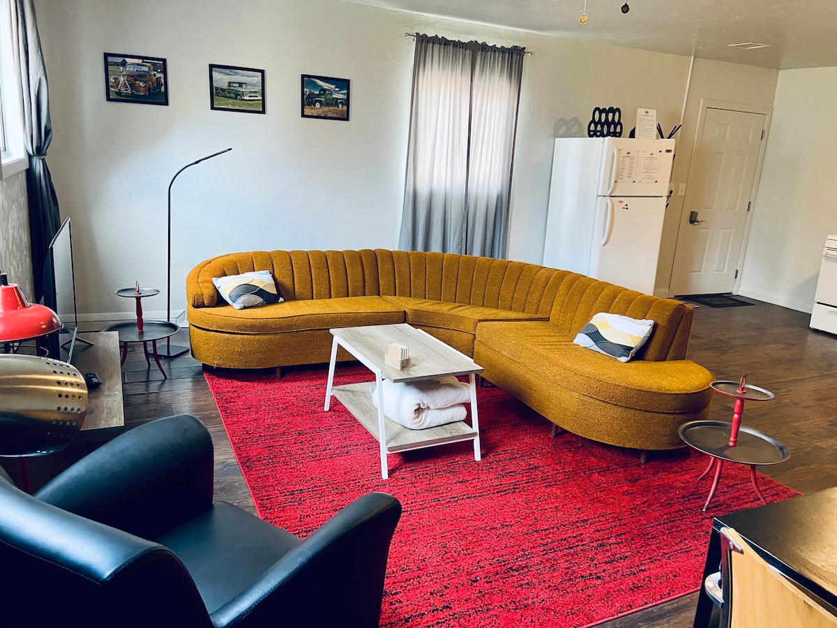 Apartament nou construit cu 1 dormitor, cu pat matrimonial, canapea extensibilă din spumă cu memorie și bucătărie complet utilată. Relaxează-te lângă șemineul electric sau bucură-te de mese în zona de luat masa. Curte privată împrejmuită cu grătar pe gaz. Baie completă plus o jumătate de baie. Încărcător Tesla dedicat și parcare în incintă. Afiliat cu o alee de bowling din apropiere (PinBowl Alley) care oferă, de asemenea, mâncare și pinball. Perfect pentru călătorii care trec sau o ședere relaxantă. Rezervă acum pentru confort, comoditate și distracție!