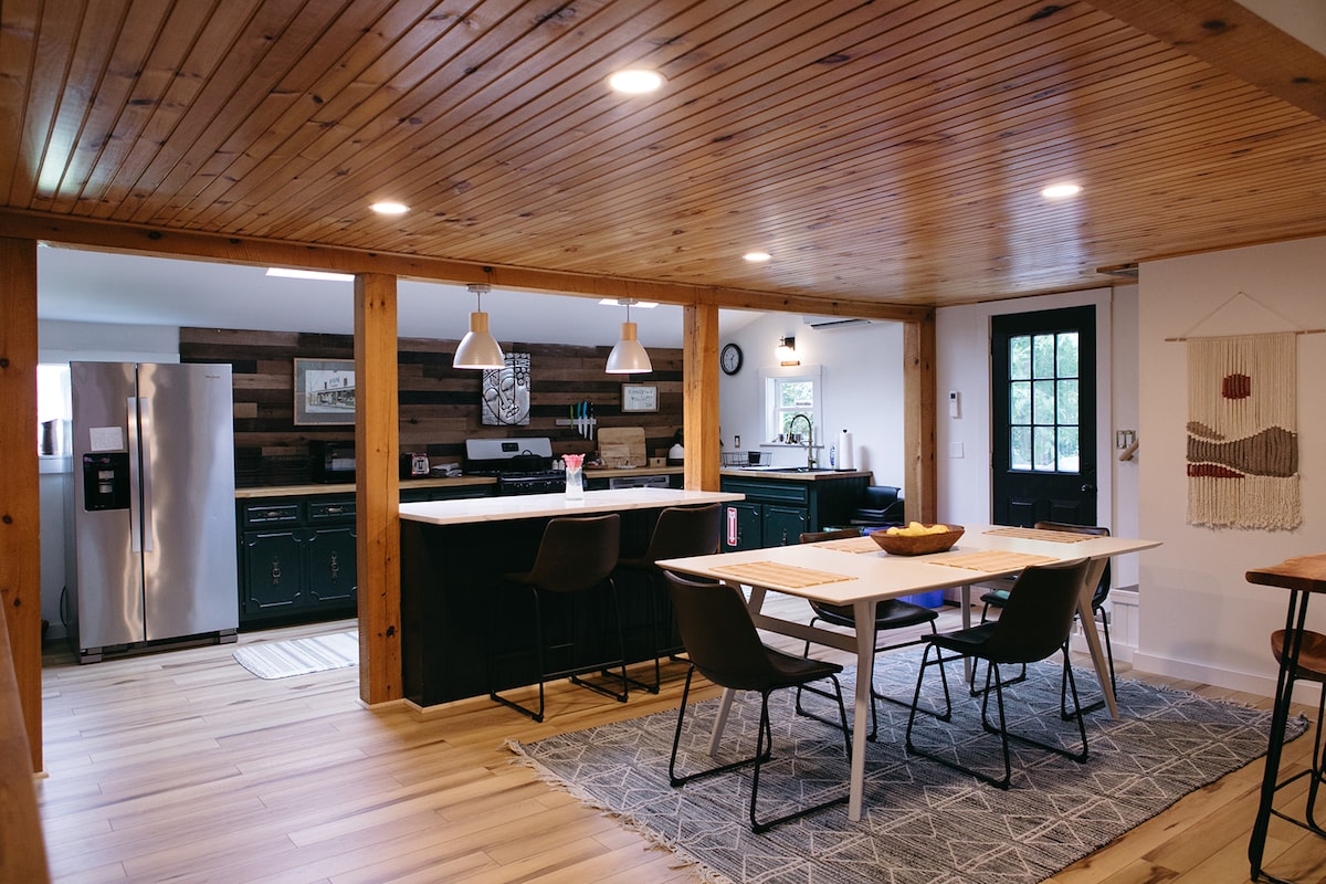 This modern lakehouse is situated on Hogan Pond in Oxford Maine. Here you can stay with all the comforts of a beautiful lakehouse built in 2020 while being feet from the water. This is a great place to vacation whether you prefer the private sandy beach, the A/C inside complete with Smart TV cable and Wifi, or the hottub! Sip a drink at the bar while watching the game or use the grill on the deck but be sure to use the built in sound system to play your music throughout the house and deck.