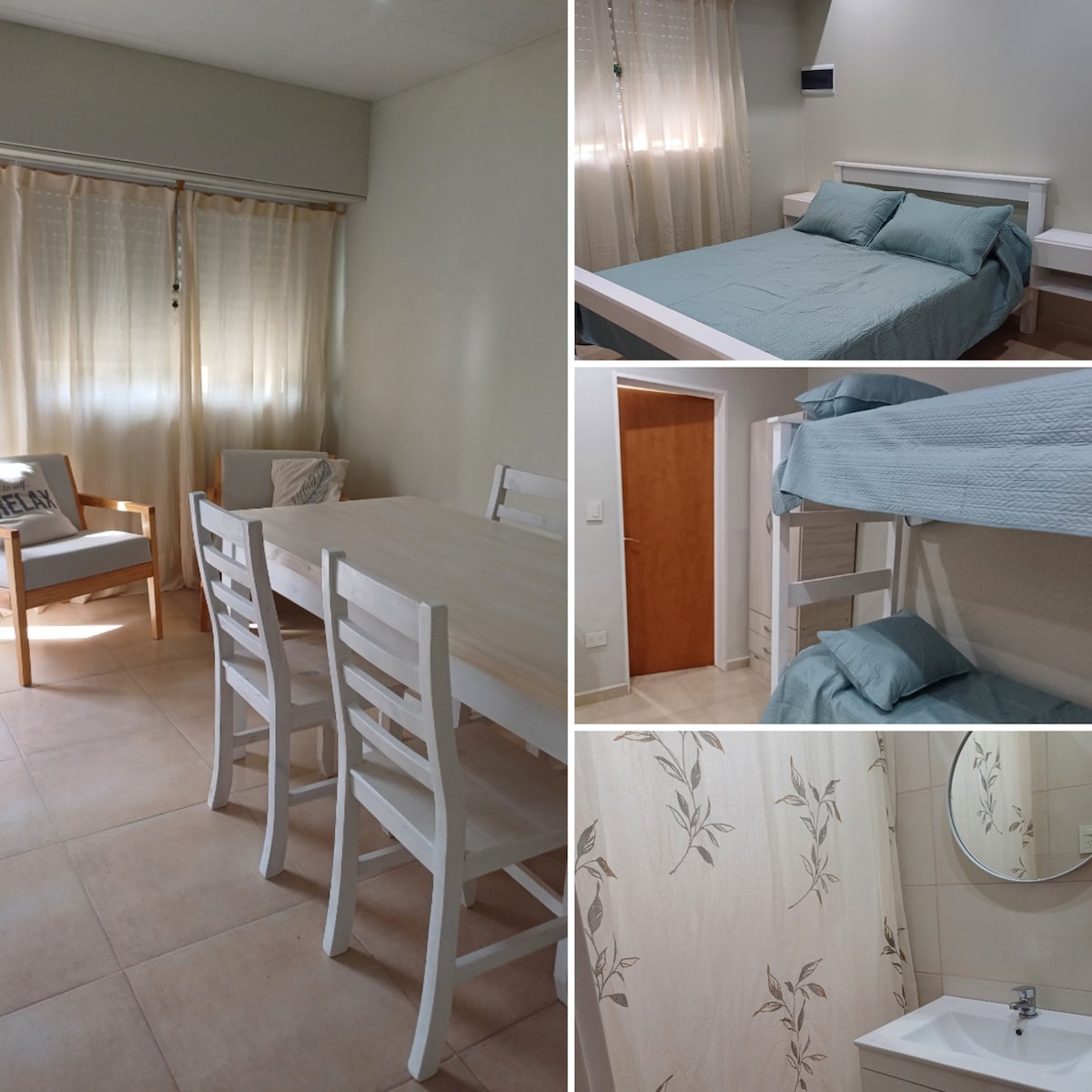 Departamento cómodo para 4 personas. Dos habitaciones, una doble y otra con dos camas individuales. Cuenta con AC, cocina con horno, parrilla y estacionamiento. A pocas calles de la playa y cerquita del Bosque Encantado. Hay un supermercado a 200m.