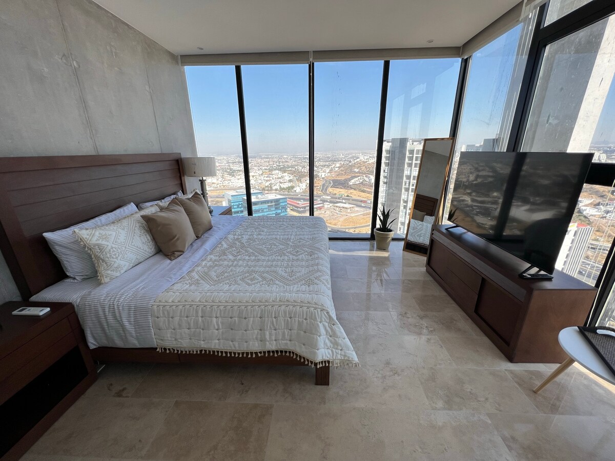 ¡Descoperă cele mai uluitoare priveliști din Querétaro! din acest apartament modern în stil industrial. La doar 10 minute de centrul orașului, bucură-te de priveliști incredibile atât ale orașului, cât și muntelui. Perfect pentru grupuri de până la 6 persoane. Este ideal pentru călătorii de afaceri sau plăcere pentru acces ușor, magazine și capacitatea de a face check-in în șederea ta. Camerele au aer condiționat și încălzire. Experimentează confortul pe care acest apartament îl oferă.