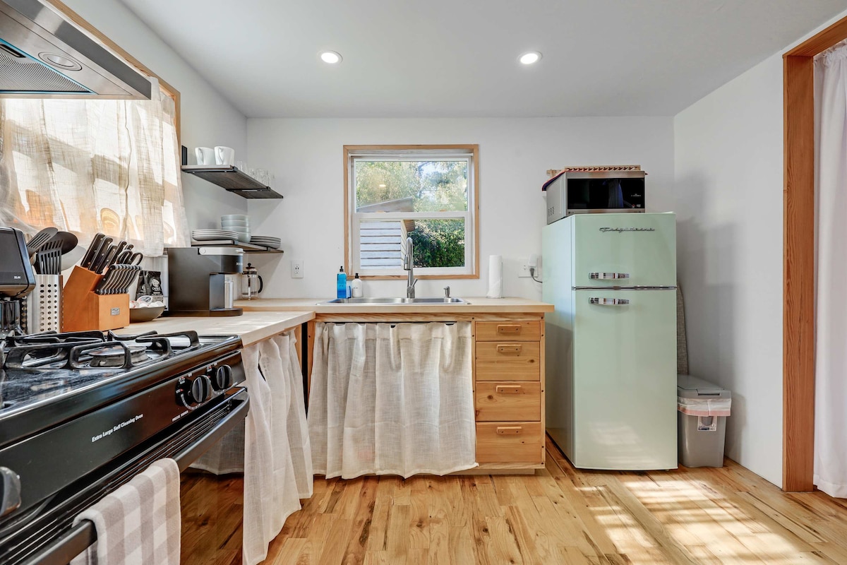 From start to finish our space is a delight! Inside a treasure of bespoke woodwork and thoughtful design creates a stunning 'traditional meets modern' space you will enjoy for its beauty and flow. It offers handpainted shiplap ceilings, real antique cedar/stone walls, custom cabinetry, dimmable lights, full kitchen, easy access outlets and a private entrance from the side courtyard, a lovely place to sit and enjoy our incredible edible yard with berries, figs, fruit, herbs, &veggies growing.