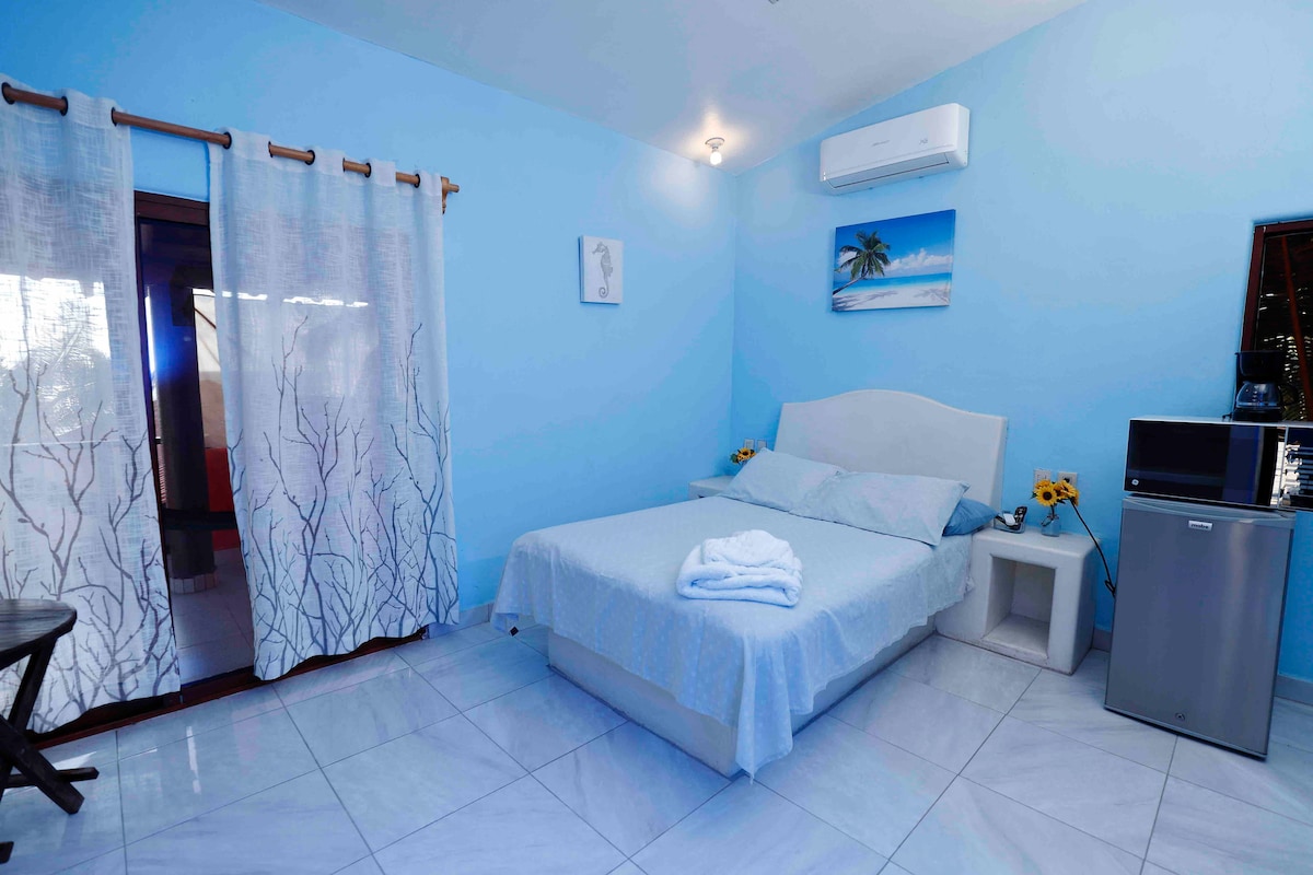 apartament frumos cu dormitor și cazare, serviciu de internet, TV, aer condiționat, chicinetă, 1 pat dublu și o canapea extensibilă dublă ideală pentru cupluri sau căsătorii cu 2 copii sub 12 ani perfect cazați sau maxim 3 adulți, locul este situat la 1/2 bloc de plajă și la 5 minute de mers pe jos de centrul orașului, la doi pași de restaurantele cafenelelor
