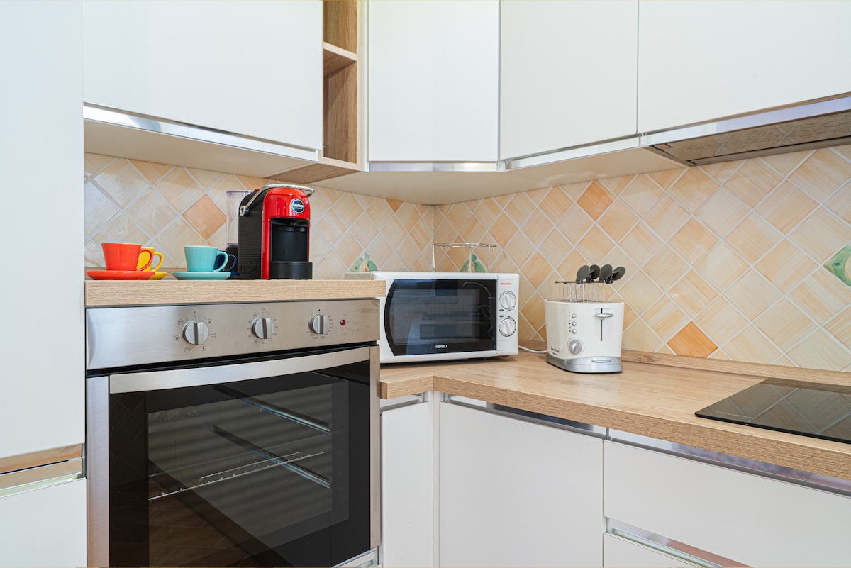 Apartament frumos la 5 minute de mers pe jos de plajă, cu o verandă mare cu vedere la mare, grădină privată cu grătar și duș, 2 dormitoare cu cearșafuri incluse, inclusiv dublu cu vedere la mare, un living mare cu chicinetă cu cuptor și aragaz, prăjitor de pâine, fierbător de apă și aparat de cafea. Pătuț și scaun înalt incluse . Parcare privată, baie cu duș mare din zidărie. Fibră WI-FI de 1 GB/S. Cea mai recentă generație Smart TV cu acces gratuit la Netflix.