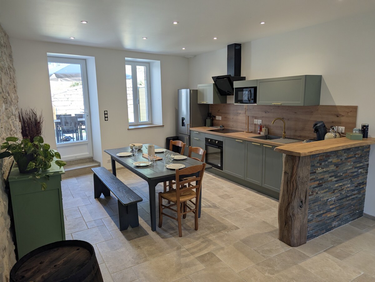 En raison du contexte sanitaire, les fêtes et événements ne sont pas autorisés. Bâtisse mitoyenne de caractère datée de 1820 refaite à neuf, en 2019, dans un petit village du Revermont dans l'Ain (Jura Sud). Cette maison de charme, chargée d’histoire, a accueilli un hospice, puis a été louée à des habitants sinistrés suite à l’incendie du village le 18 juillet 1944 (Grand Brûle), et à partir de 1957 a été transformée en colonie de vacances.