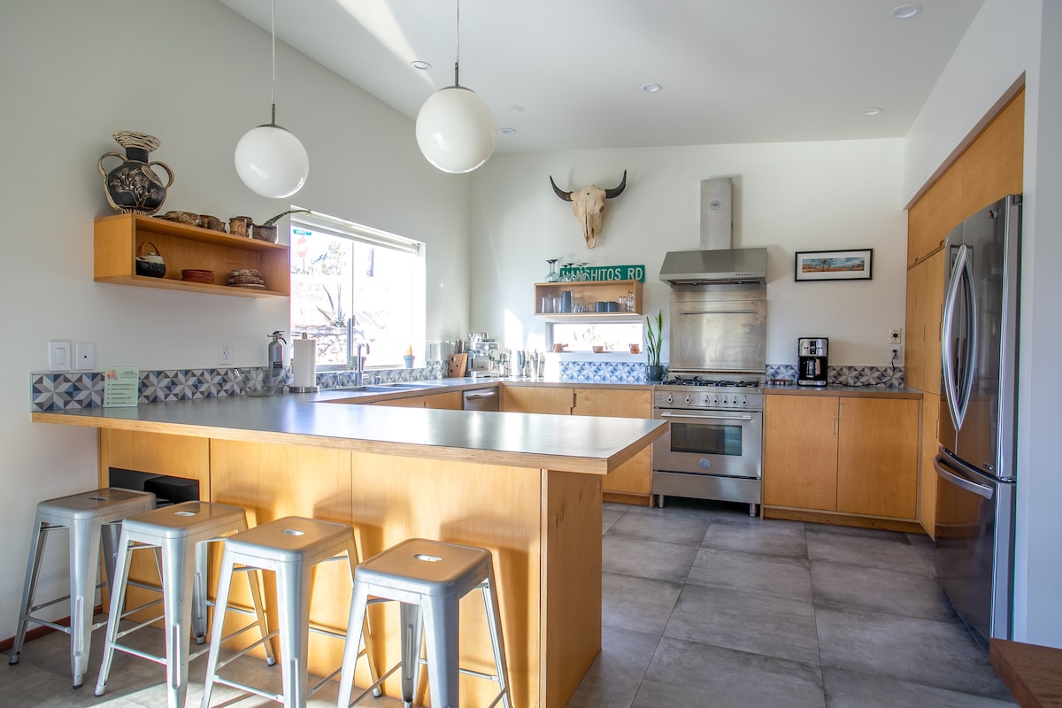 Evadează în Dreamcatcher Hideaway, un bungalou elegant cu 2 dormitoare și 2 băi, în inima orașului Joshua Tree. La doar 800 de metri de magazinele, restaurantele și cafenelele vibrante și la numai 8 km de intrarea vestică a Parcului Național Joshua Tree, acest refugiu modern îmbină liniștea deșertului cu confortul urban. Relaxează-te într-o locuință plină de lumină, cu o bucătărie gourmet, home theater, cadă cu hidromasaj, căzi adânci, mese în aer liber, grătar cu propan, vatră, hamac și un încărcător EV de nivel 2.