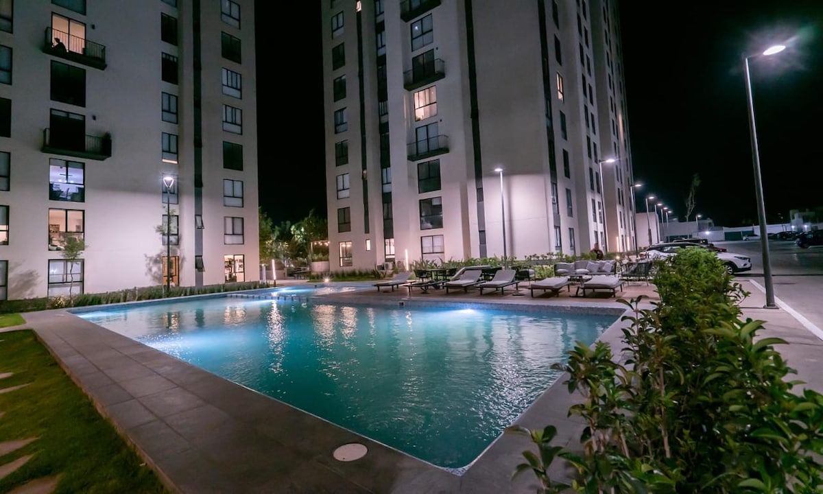 Bonito Departamento completo nuevo de lujo amueblado con vista panorámica hacia la ciudad en el piso 12, cuenta con gimnasio, areas sociales, roof garden, terraza, jardines, cancha de fútbol, estacionamiento para 2 carros, acceso con seguridad 24 horas, esta muy cerca de sams, home depot, Zoológico, a 5 min de la barranca de Huentitán, a 20 minutos del centro comercial andares, 15 min del centro, acceso a escuelas y vias de distribución principales. Pantalla de 65" wifi, netflix bien decorado