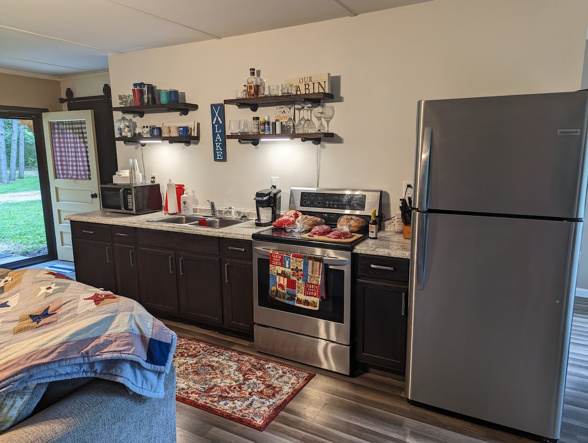 Peste 5 acri de seninătate pură, doar sunetul naturii din jurul tău! Frumos lac Tucker cu trasee de drumeții peste tot în jurul său, la doar o milă distanță. Acest parc, cum ar fi atmosfera, are loc pentru corturi, rulote , bărci, 4 roți și multe altele. La mai puțin de 5 mile de fabulosul oraș francez Lick și West Baden Resort, dar complet retrasă. Cabin are două verande cu planoare de balansoar și priveliști cerești. Leagăn de cedru, masă de picnic, groapă de foc cu scaune adirondack pentru grătare noaptea târziu. Închiriere de parcuri acvatice și bărci, în apropiere